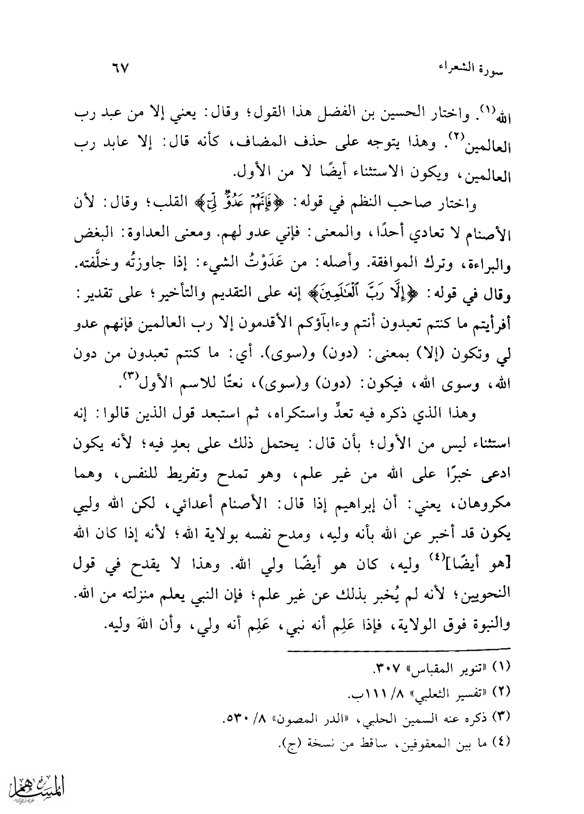 واختار صاحب النظم في قوله: {فَإِنَّهُمْ عَدُوٌّ لِي} القلب؛ وقال: لأن الأصنام لا تعادي أحدًا، والمعنى: فإني عدو لهم. ومعنى العداوة: البغض والبراءة، وترك الموافقة. وأصله: من عَدَوْتُ الشيء: إذا جاوزتُه وخلَّفته. وقال في قوله: {إِلَّا رَبَّ الْعَالَمِينَ} إنه على التقديم والتأخي؛ على تقدير: أفرأيتم ما كنتم تعبدون أنتم وءابآؤكم الأقدمون إلا رب العالمين فإنهم عدو لي وتكون (إلا) بمعنى: (دون) و (سوى). أي: ما كنتم تعبدون من دون الله، وسوى الله، فيكون: (دون) و (سوى)، نعتًا للاسم الأول (¬3).