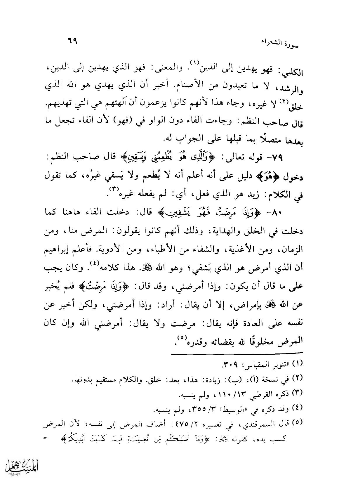 80 - {وَإِذَا مَرِضْتُ فَهُوَ يَشْفِينِ} قال: دخلت الفاء هاهنا كما دخلت في الخلق والهداية، وذلك أنهم كانوا يقولون: المرض منا، ومن الزمان، ومن الأغذية، والشفاء من الأطباء، ومن الأدوية. فأعلم إبراهيم أن الذي أمرض هو الذي يَشفي؛ وهو الله -عز وجل-. هذا كلامه (¬4). وكان يجب على ما قال أن يكون: وإذا أمرضني، وقد قال: {وَإِذَا مَرِضْتُ} فلم يُخبر عن الله -عز وجل- بإمراض، إلا أن يقال: أراد: وإذا أمرضني، ولكن أخبر عن نفسه على العادة فإنه يقال: مرضت ولا يقال: أمرضني الله وإن كان المرض مخلوقًا لله بقضائه وقدره (¬5).
