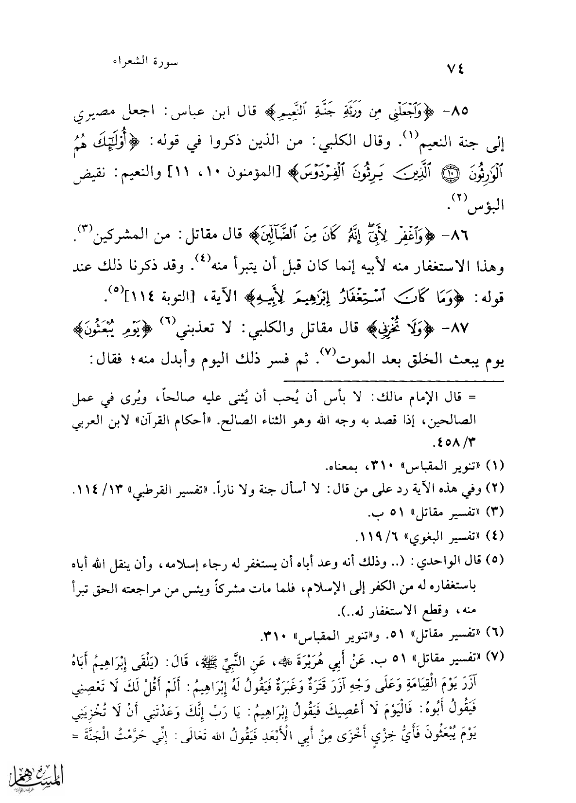 (¬7) "تفسير مقاتل" 51 ب. عَنْ أَبِي هُرَيْرَةَ -رضي الله عنه-، عَنِ النَّبِيِّ -صلى الله عليه وسلم-، قَالَ: (يَلْقَى إِبْرَاهِيمُ أَبَاهُ آزَرَ يَوْمَ الْقِيَامَةِ وَعَلَى وَجْهِ آزَرَ قَتَرَةٌ وَغَبَرَةٌ فَيَقُولُ لَهُ إِبْرَاهِيم: أَلَمْ أَقُلْ لَكَ لَا تَعْصِنِي فَيقُولُ أَبُوهُ: فَالْيَوْمَ لَا أَعْصِيكَ فَيَقُولُ إِبْرَاهِيمُ: يَا رَبِّ إنكَ وَعَدْتَنِي أَنْ لَا تُخْزِيَنِي يَوْمَ يُبْعَثُونَ فَأَيُّ خِزيٍ أَخْزَلى مِنْ أَبِي الأَبْعَدِ فَيَقُولُ الله تَعَالَى: إِنِّي حَرَّمْتُ الْجَنَّةَ =