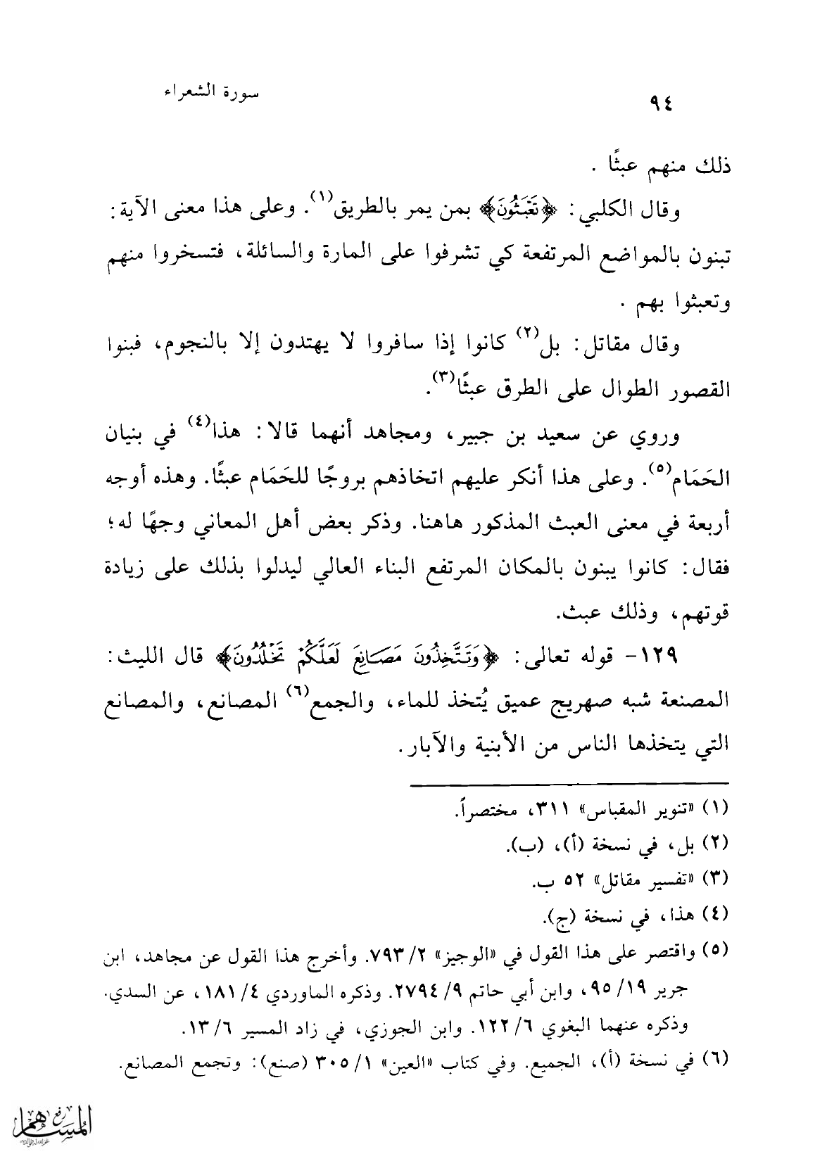 129 - قوله تعالى: {وَتَتَّخِذُونَ مَصَانِعَ لَعَلَّكُمْ تَخْلُدُونَ} قال الليث: المصنعة شبه صهريج عميق يُتخذ للماء، والجمع (¬6) المصانع، والمصانع التي يتخذها الناس من الأبنية والآبار.