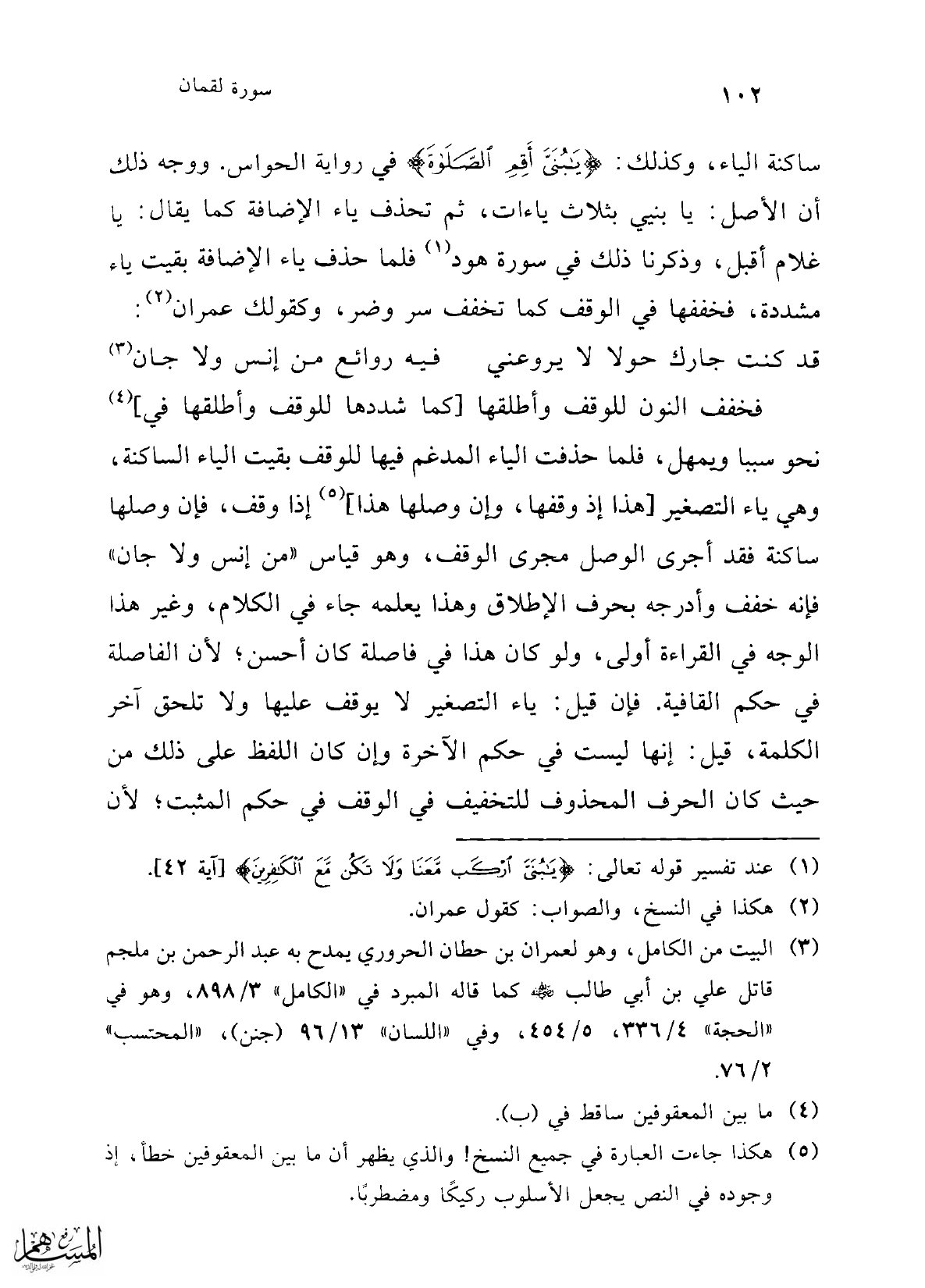 ساكنة الياء، وكذلك: {يَا بُنَيَّ أَقِمِ الصَّلَاةَ} في رواية الحواس. ووجه ذلك أن الأصل: يا بنيي بثلاث ياءات، ثم تحذف ياء الإضافة كما يقال: يا غلام أقبل، وذكرنا ذلك في سورة هود (¬1) فلما حذف ياء الإضافة بقيت ياء مشددة، فخففها في الوقف كما تخفف سر وضر، وكقولك عمران (¬2):