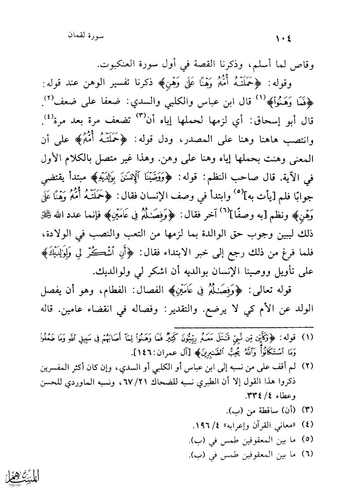 وقوله: {حَمَلَتْهُ أُمُّهُ وَهْنًا عَلَى وَهْنٍ} ذكرنا تفسير الوهن عند قوله: {فَمَا وَهَنُوا} (¬1) قال ابن عباس والكلبي والسدي: ضعفا على ضعف (¬2). قال أبو إسحاق: أي لزمها لحملها إياه أن (¬3) تضعف مرة بعد مرة (¬4) وانتصب هاهنا وهنا على المصدر، ودل قوله: {حَمَلَتْهُ أُمُّهُ} على أن المعنى وهنت بحملها إياه وهنا على وهن. وهذا غير متصل بالكلام الأول في الآية. قال صاحب النظم: قوله: {وَوَصَّيْنَا الْإِنْسَانَ بِوَالِدَيْهِ} مبتدأ يقتضي جوابًا فلم [يأت به] (¬5) وابتدأ في وصف الإنسان فقال: {حَمَلَتْهُ أُمُّهُ وَهْنًا عَلَى وَهْنٍ} ونظم [به وصفًا] (¬6) آخر فقال: {وَفِصَالُهُ فِي عَامَيْنِ} فإنما عدد الله -عز وجل- ذلك ليبين وجوب حق الوالدة بما لزمها من التعب والنصب في الولادة، فلما فرغ من ذلك رجع إلى خبر الابتداء فقال: {أَنِ اشْكُرْ لِي وَلِوَالِدَيْكَ} على تأويل ووصينا الإنسان بوالديه أن اشكر لي ولوالديك.