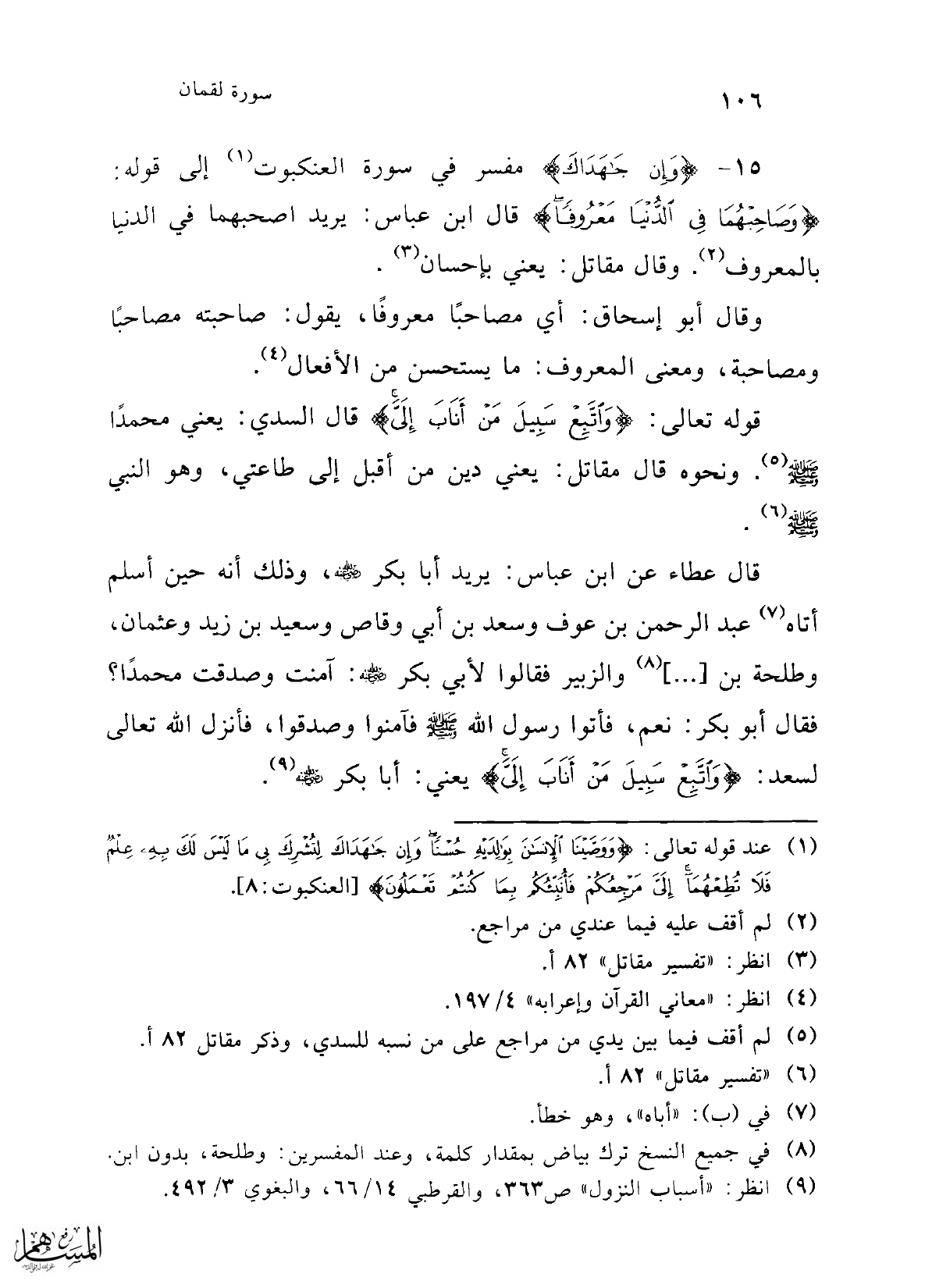قال عطاء عن ابن عباس: يريد أبا بكر -رضي الله عنه-، وذلك أنه حين أسلم أتاه (¬7) عبد الرحمن بن عوف وسعد بن أبي وقاص وسعيد بن زيد وعثمان، وطلحة بن [...] (¬8) والزبير فقالوا لأبي بكر -رضي الله عنه-: آمنت وصدقت محمدًا؟ فقال أبو بكر: نعم، فأتوا رسول الله -صلى الله عليه وسلم- فآمنوا وصدقوا، فأنزل الله تعالى لسعد: {وَاتَّبِعْ سَبِيلَ مَنْ أَنَابَ إِلَيَّ} يعني: أبا بكر -رضي الله عنه- (¬9).