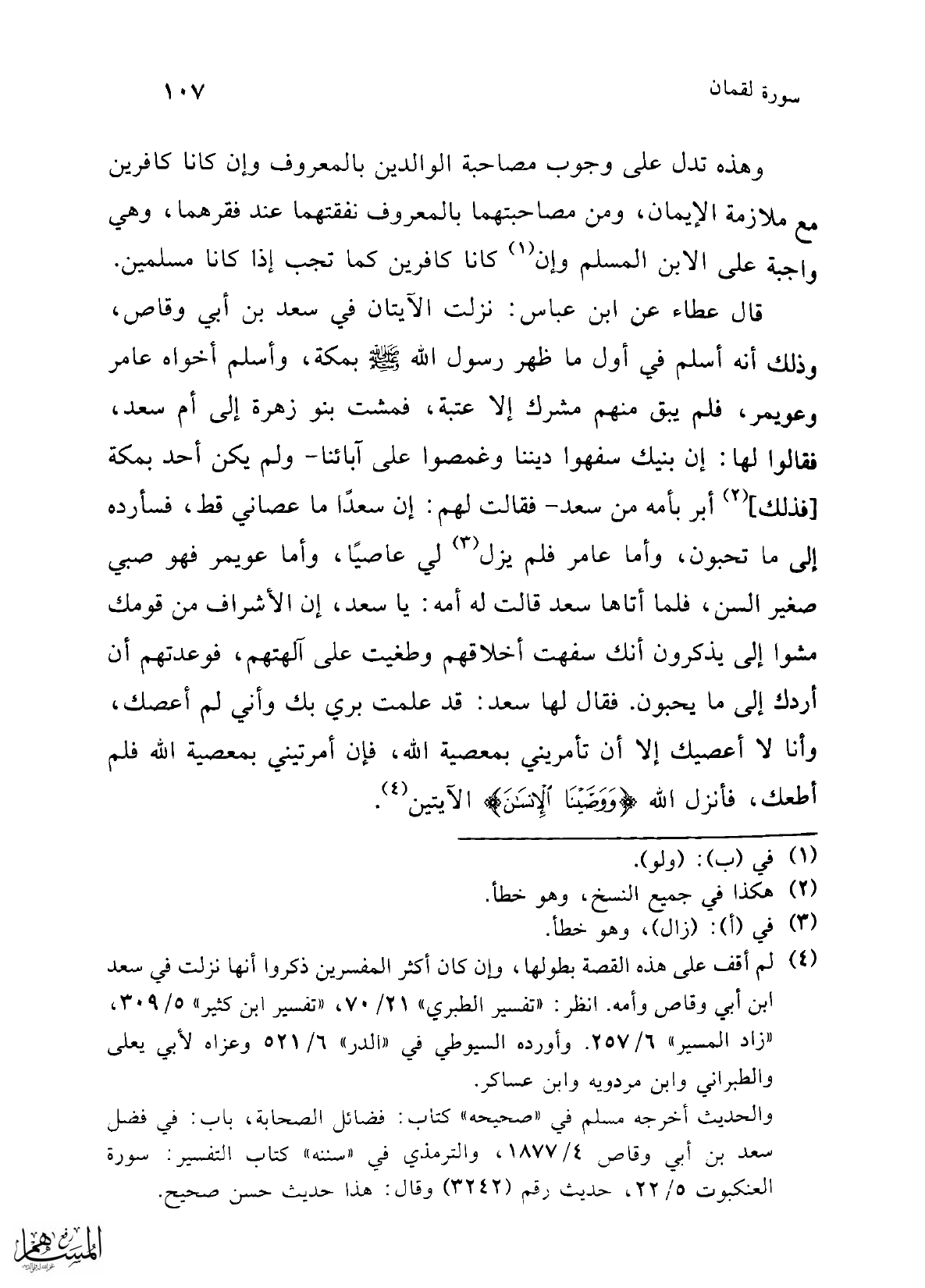 (¬4) لم أقف على هذه القصة بطولها، وإن كان أكثر المفسرين ذكروا أنها نزلت في سعد ابن أبي وقاص وأمه. انظر: "تفسير الطبري" 21/ 70، "تفسير ابن كثير" 5/ 309، "زاد المسير" 6/ 257. وأورده السيوطي في "الدر" 6/ 521 وعزاه لأبي يعلى والطبراني وابن مردويه وابن عساكر.