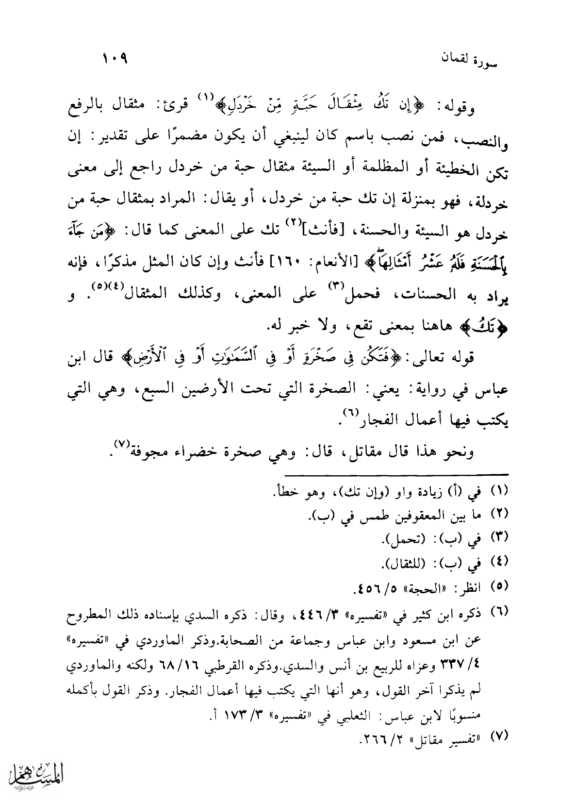 وقوله: {إِنْ تَكُ مِثْقَالَ حَبَّةٍ مِنْ خَرْدَلٍ} (¬1) قرئ: مثقال بالرفع والنصب، فمن نصب باسم كان لينبغي أن يكون مضمرًا على تقدير: إن تكن الخطيئة أو المظلمة أو السيئة مثقال حبة من خردل راجع إلى معنى خردلة، فهو بمنزلة إن تك حبة من خردل، أو يقال: المراد بمثقال حبة من خردل هو السيئة والحسنة، [فأنث] (¬2) تك على المعنى كما قال: {مَنْ جَاءَ بِالْحَسَنَةِ فَلَهُ عَشْرُ أَمْثَالِهَا} [الأنعام: 160] فأنث وإن كان المثل مذكرًا، فإنه يراد به الحسنات، فحمل (¬3) على المعنى، وكذلك المثقال (¬4) (¬5). و {تَكُ} هاهنا بمعنى تقع، ولا خبر له.