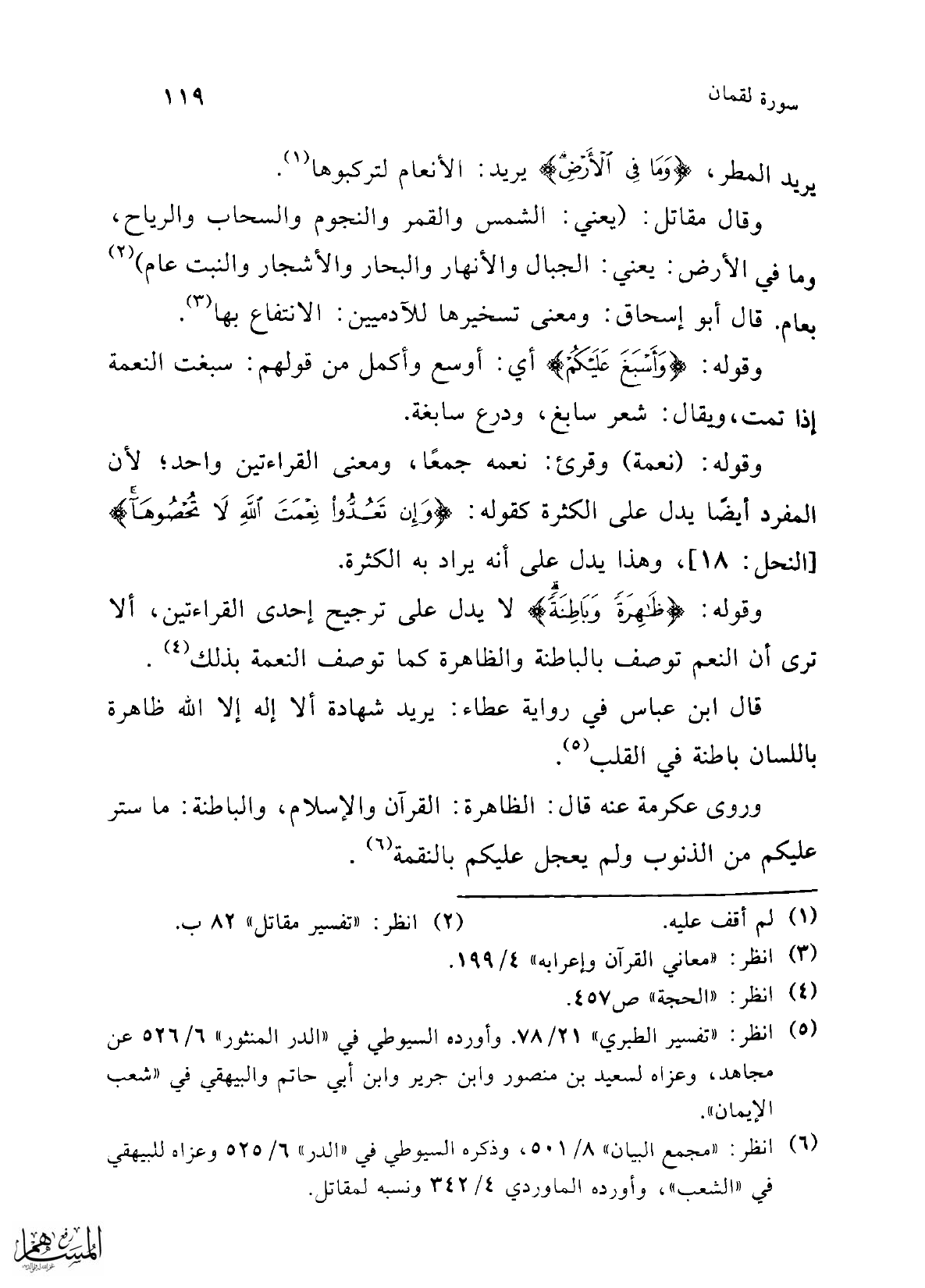 وقوله: {ظَاهِرَةً وَبَاطِنَةً} لا يدل على ترجيح إحدى القراءتين، ألا ترى أن النعم توصف بالباطنة والظاهرة كما توصف النعمة بذلك (¬4).