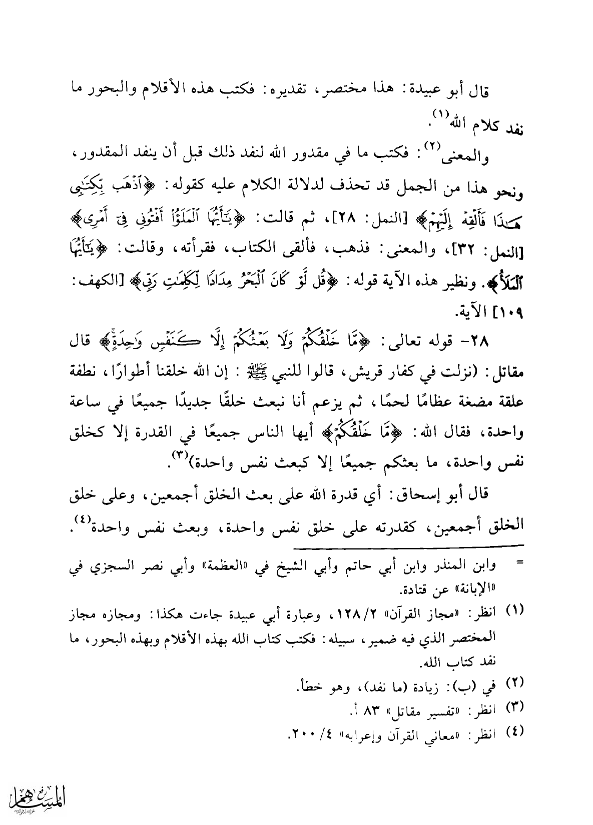 (¬1) انظر: "مجاز القرآن" 2/ 128، وعبارة أبي عبيدة جاءت هكذا: ومجازه مجاز المختصر الذي فيه ضمير، سبيله: فكتب كتاب الله بهذه الأقلام وبهذه البحور، ما نفد كتاب الله.
