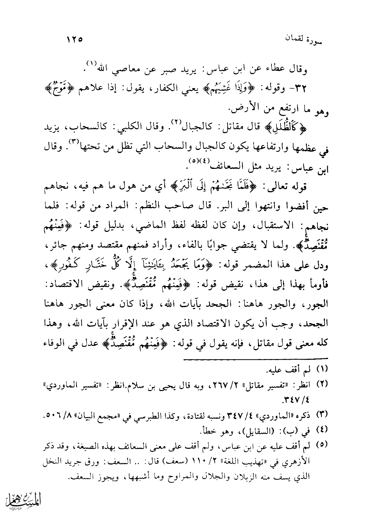 قوله تعالى: {فَلَمَّا نَجَّاهُمْ إِلَى الْبَرِّ} أي من هول ما هم فيه، نجاهم حين أفضوا وانتهوا إلى البر. قال صاحب النظم: المراد من قوله: فلما نجاهم: الاستقبال، وإن كان لفظه لفظ الماضي، بدليل قوله: {فَمِنْهُمْ مُقْتَصِدٌ}. ولما لا يقتضي جوابًا بالفاء، وأراد فمنهم مقتصد ومنهم جاثر، ودل على هذا المضمر قوله: {وَمَا يَجْحَدُ بِآيَاتِنَا إِلَّا كُلُّ خَتَّارٍ كَفُورٍ} فأومأ بهذا إلى هذا، نقيض قوله: {فَمِنْهُمْ مُقْتَصِد}. ونقيض الاقتصاد: الجور، والجور هاهنا: الجحد بآيات الله، وإذا كان معنى الجور هاهنا الجحد، وجب أن يكون الاقتصاد الذي هو عند الإقرار بآيات الله، وهذا كله معنى قول مقاتل، فإنه يقول في قوله: {فَمِنْهُمْ مُقْتَصِدٌ} عدل في الوفاء
