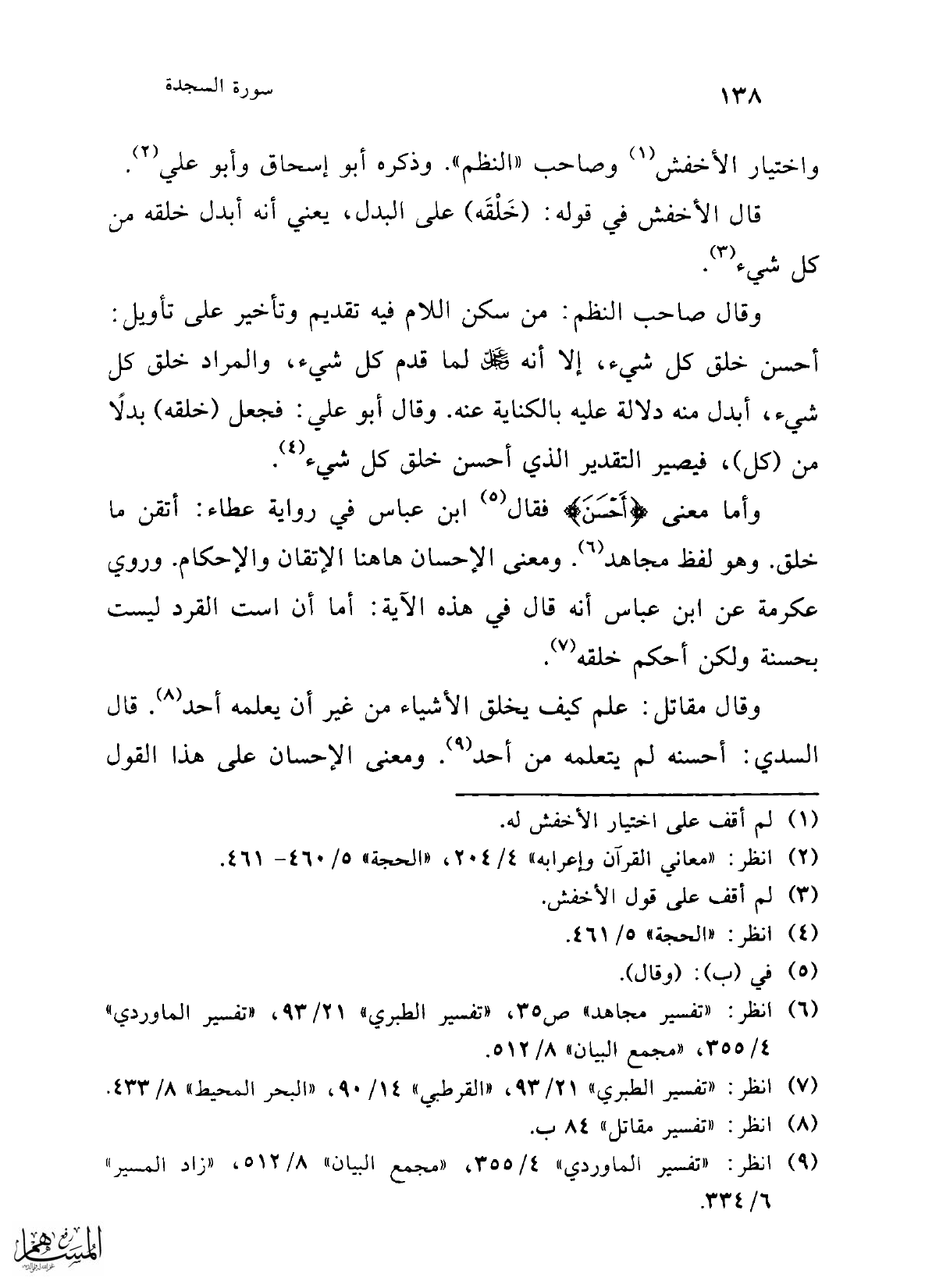 وقال صاحب النظم: من سكن اللام فيه تقديم وتأخير على تأويل: أحسن خلق كل شيء، إلا أنه -عز وجل- لما قدم كل شيء، والمراد خلق كل شيء، أبدل منه دلالة عليه بالكناية عنه. وقال أبو علي: فجعل (خلقه) بدلاً من (كل)، فيصير التقدير الذي أحسن خلق كل شيء (¬4).