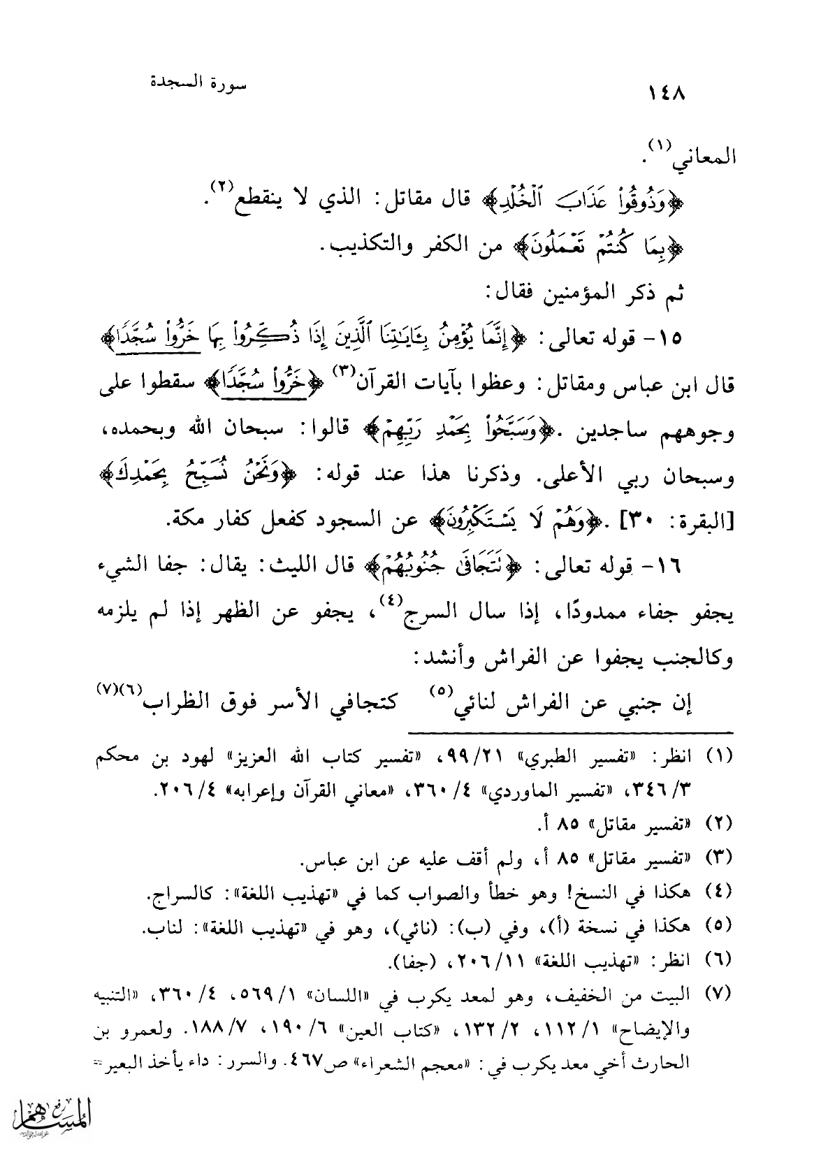 16 - قوله تعالى: {تَتَجَافَى جُنُوبُهُمْ} قال الليث: يقال: جفا الشيء يجفو جفاء ممدودًا، إذا سأل السرج (¬4)، يجفو عن الظهر إذا لم يلزمه وكالجنب يجفوا عن الفراش وأنشد: