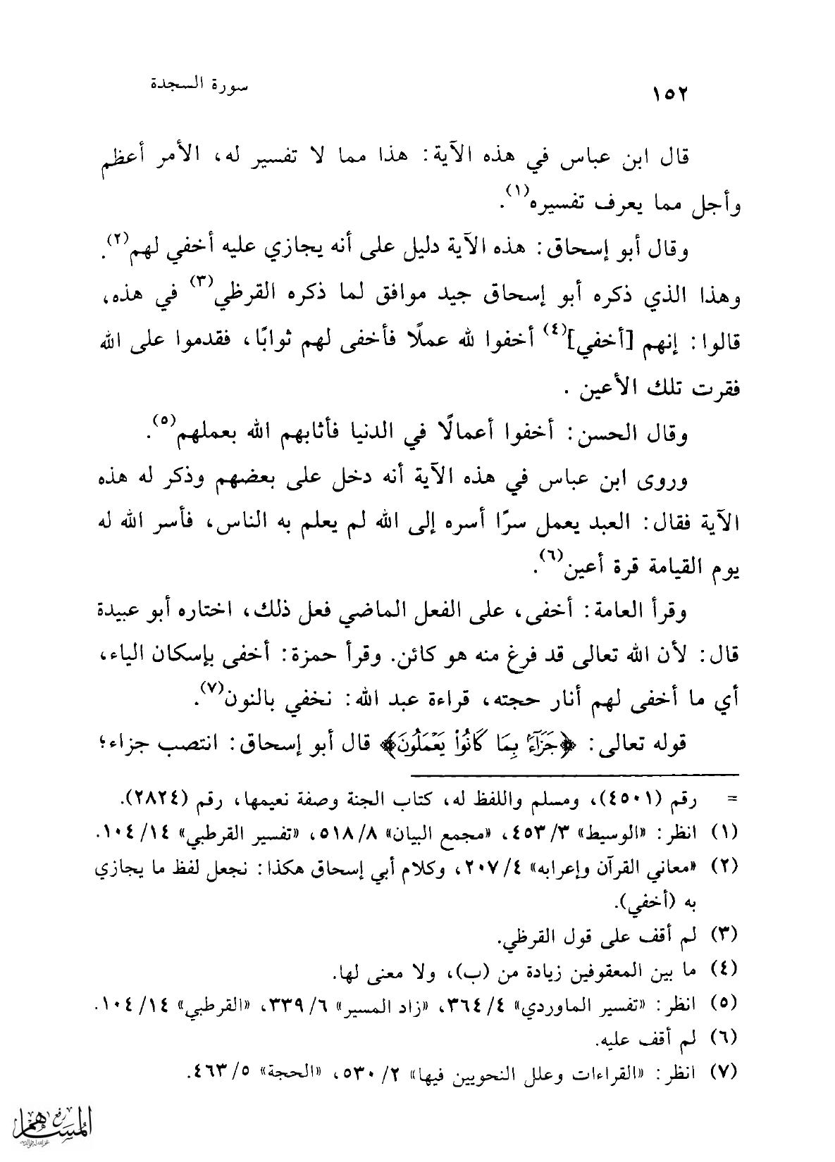 وقرأ العامة: أخفى، على الفعل الماضي فعل ذلك، اختاره أبو عبيدة قال: لأن الله تعالى قد فرغ منه هو كائن. وقرأ حمزة: أخفى بإسكان الياء، أي ما أخفى لهم أنار حجته، قراءة عبد الله: نخفي بالنون (¬7).