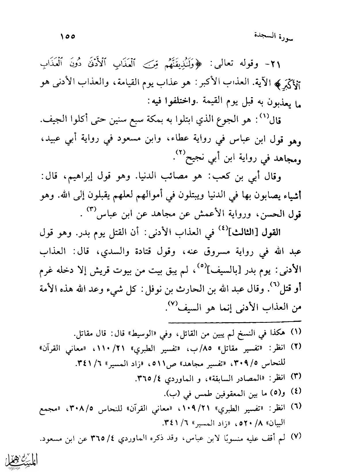 21 - وقوله تعالى: {وَلَنُذِيقَنَّهُمْ مِنَ الْعَذَابِ الْأَدْنَى دُونَ الْعَذَابِ الْأَكْبَرِ} الآية. العذاب الأكبر: هو عذاب يوم القيامة، والعذاب الأدنى هو ما يعذبون به قبل يوم القيامة. واختلفوا فيه: