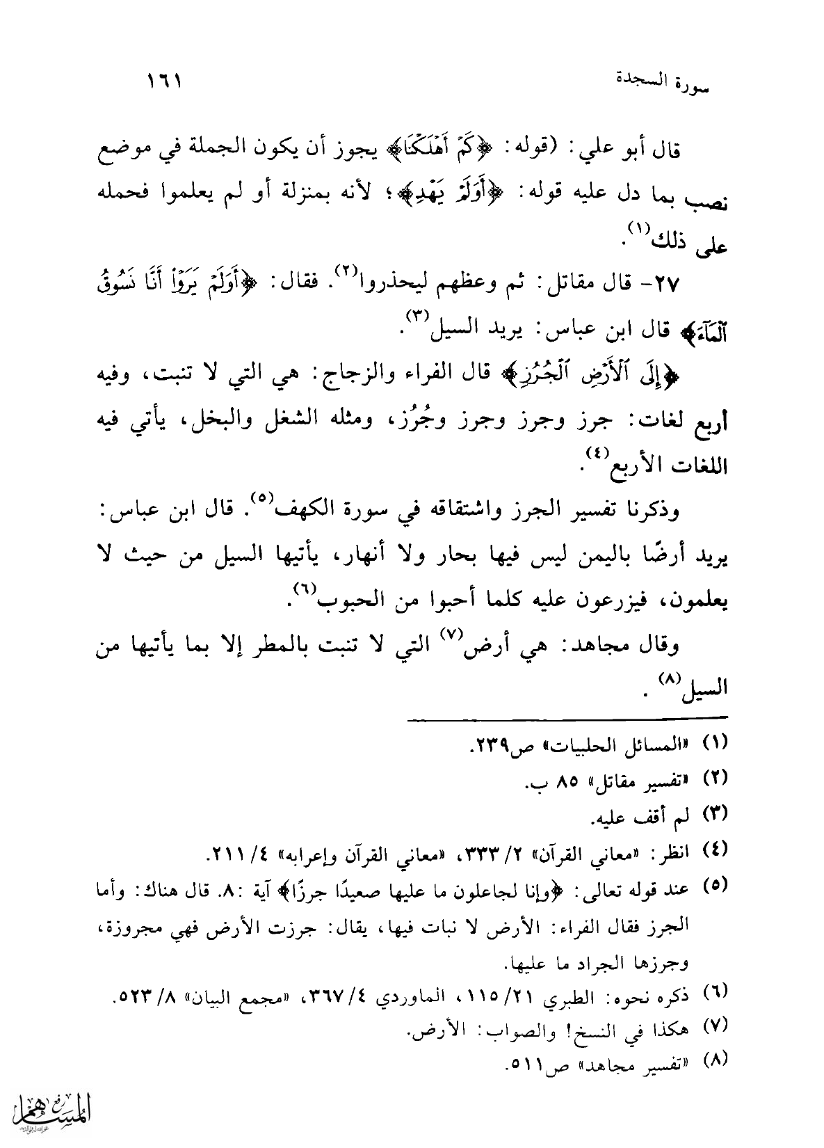 (¬5) عند قوله تعالى: {وَإِنَّا لَجَاعِلُونَ مَا عَلَيْهَا صَعِيدًا جُرُزًا} آية: 8 قال هناك: وأما المجرز فقال الفراء: الأرض لا نبات فيها، يقال: جرزت الأرض فهي مجروزة، وجرزها الجراد ما عليها.