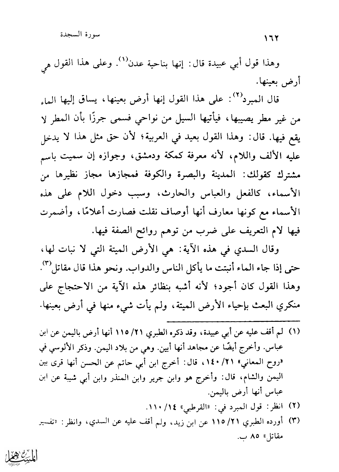 قال المبرد (¬2): على هذا القول إنها أرض بعينها، يساق إليها الماء من غير مطر يصيبها، فيأتيها السيل من نواحي فسمى جرزًا بأن المطر لا يقع فيها. قال: وهذا القول بعيد في العربية؛ لأن حق مثل هذا لا يدخل عليه الألف واللام؛ لأنه معرفة كمكة ودمشق، وجوازه إن سميت باسم مشترك كقولك: المدينة والبصرة والكوفة فمجازها مجاز نظيرها من الأسماء، كالفعل والعباس والحارث، وسبب دخول اللام على هذه الأسماء مع كونها معارف أنها أوصاف نقلت فصارت أعلامًا، وأضمرت فيها لام التعريف على ضرب من توهم روائح الصفة فيها.