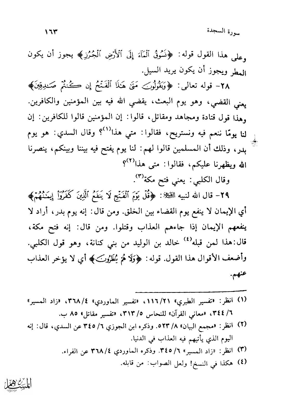 28 - قوله تعالى: {وَيَقُولُونَ مَتَى هَذَا الْفَتْحُ إِنْ كُنْتُمْ صَادِقِينَ} يعني القضي، وهو يوم البعث، يقضي الله فيه بين المؤمنين والكافرين. وقول قول قتادة ومجاهد ومقاتل، قالوا: إن المؤمنين قالوا للكافرين: إن لنا يومًا ننعم فيه ونستريح، فقالوا: متي هذا (¬1)؟ وقال السدي: هو يوم بدر، وذلك أن المسلمين قالوا لهم: لنا يوم يفتح فيه بيننا وبينكم، ينصرنا الله ويظهرنا عليكم، فقالوا: متى هذا (¬2)؟