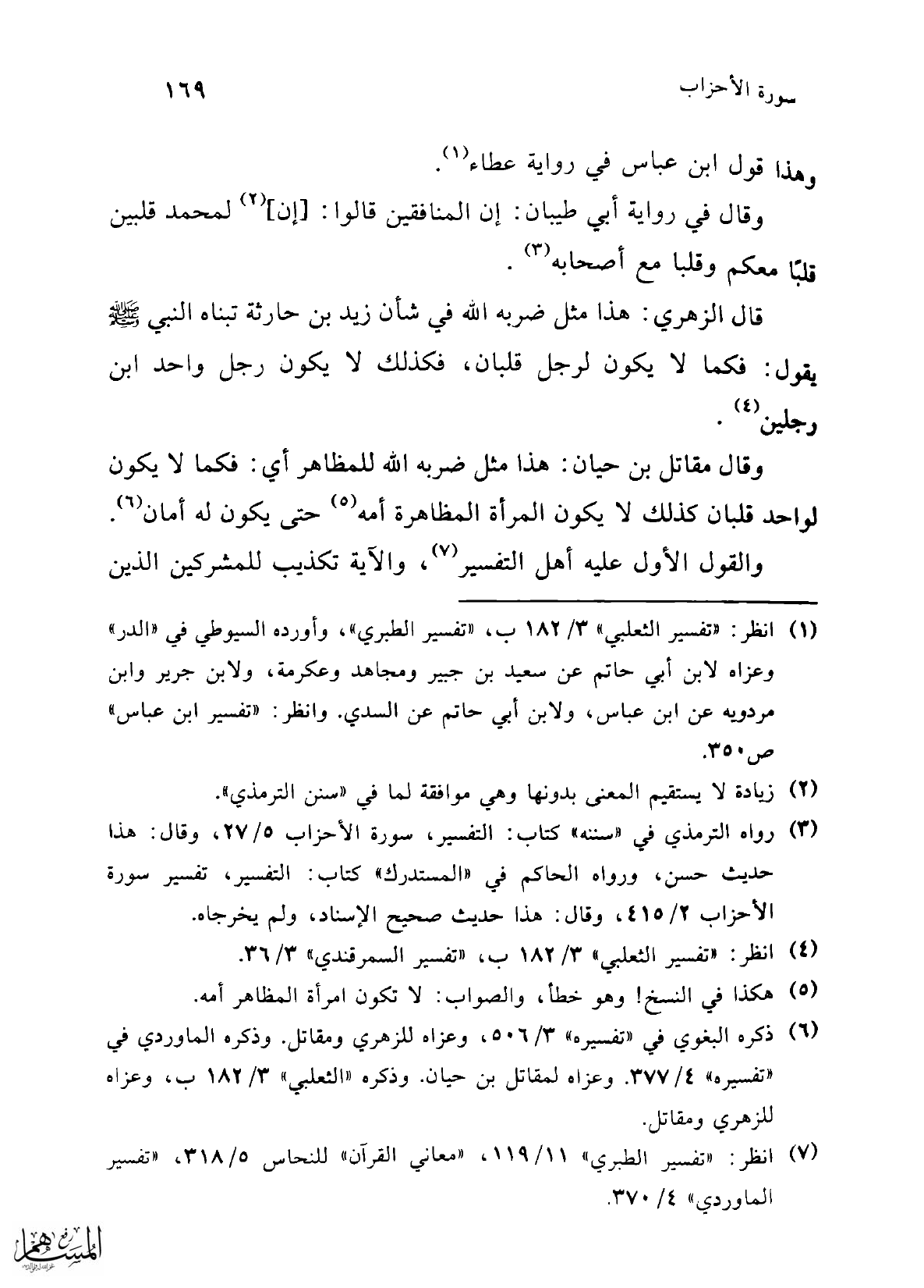 وقال الزهري: هذا مثل ضربه الله في شأن زيد بن حارثة تبناه النبي -صلى الله عليه وسلم- يقول: فكما لا يكون لرجل قلبان، فكذلك لا يكون رجل واحد ابن رجلين (¬4).