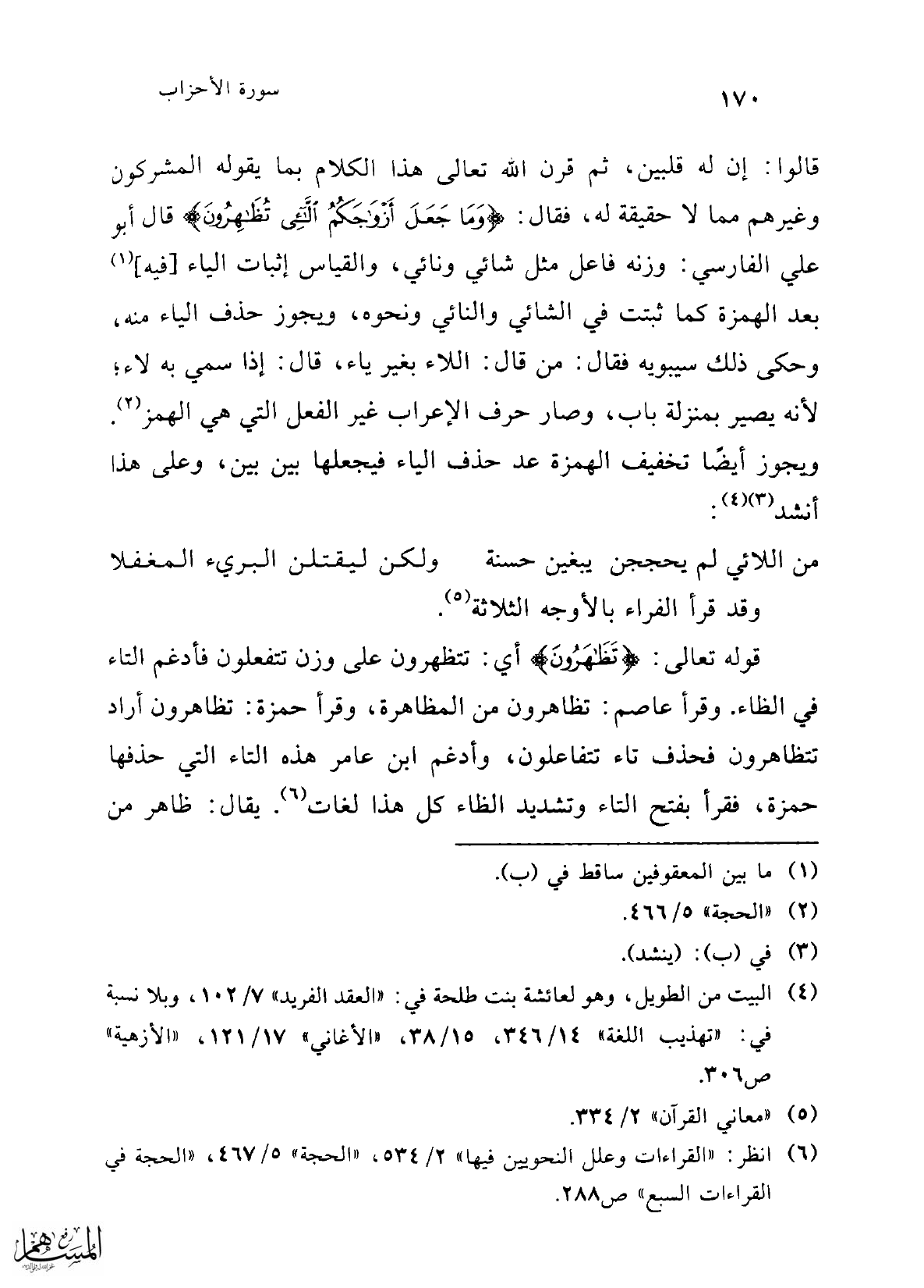 (¬6) انظر: "القراءات وعلل النحويين فيها" 2/ 534، "الحجة" 5/ 467، "الحجة في القراءات السبع" ص 288.