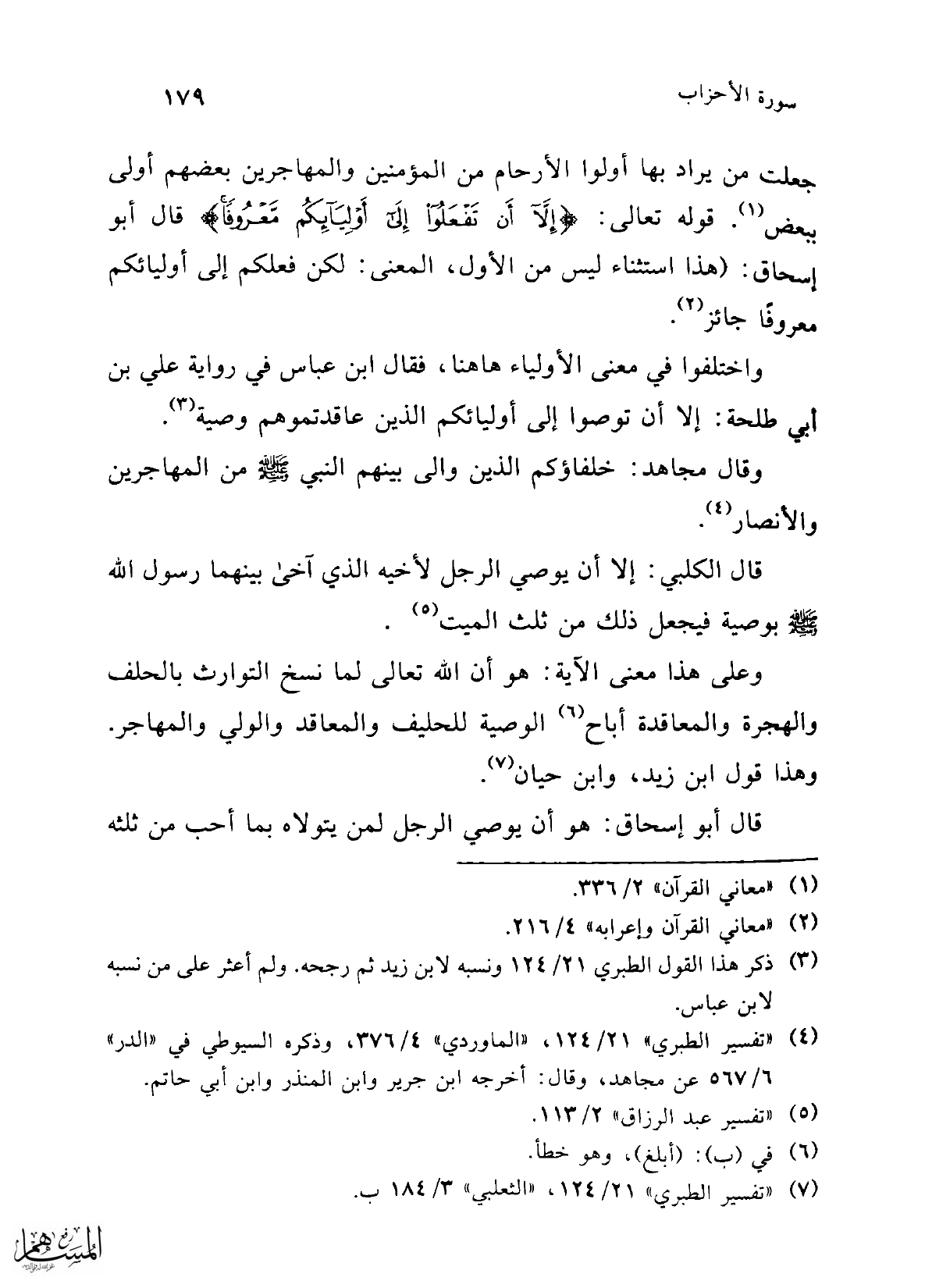 جعلت من يراد بها أولوا الأرحام من المؤمنين والمهاجرين بعضهم أولى ببعض (¬1). قوله تعالى: {إِلَّا أَنْ تَفْعَلُوا إِلَى أَوْلِيَائِكُمْ مَعْرُوفًا} قال أبو إسحاق: (هذا استثناء ليس من الأول، المعنى: لكن فعلكم إلى أوليائكم معروفًا جائز (¬2).