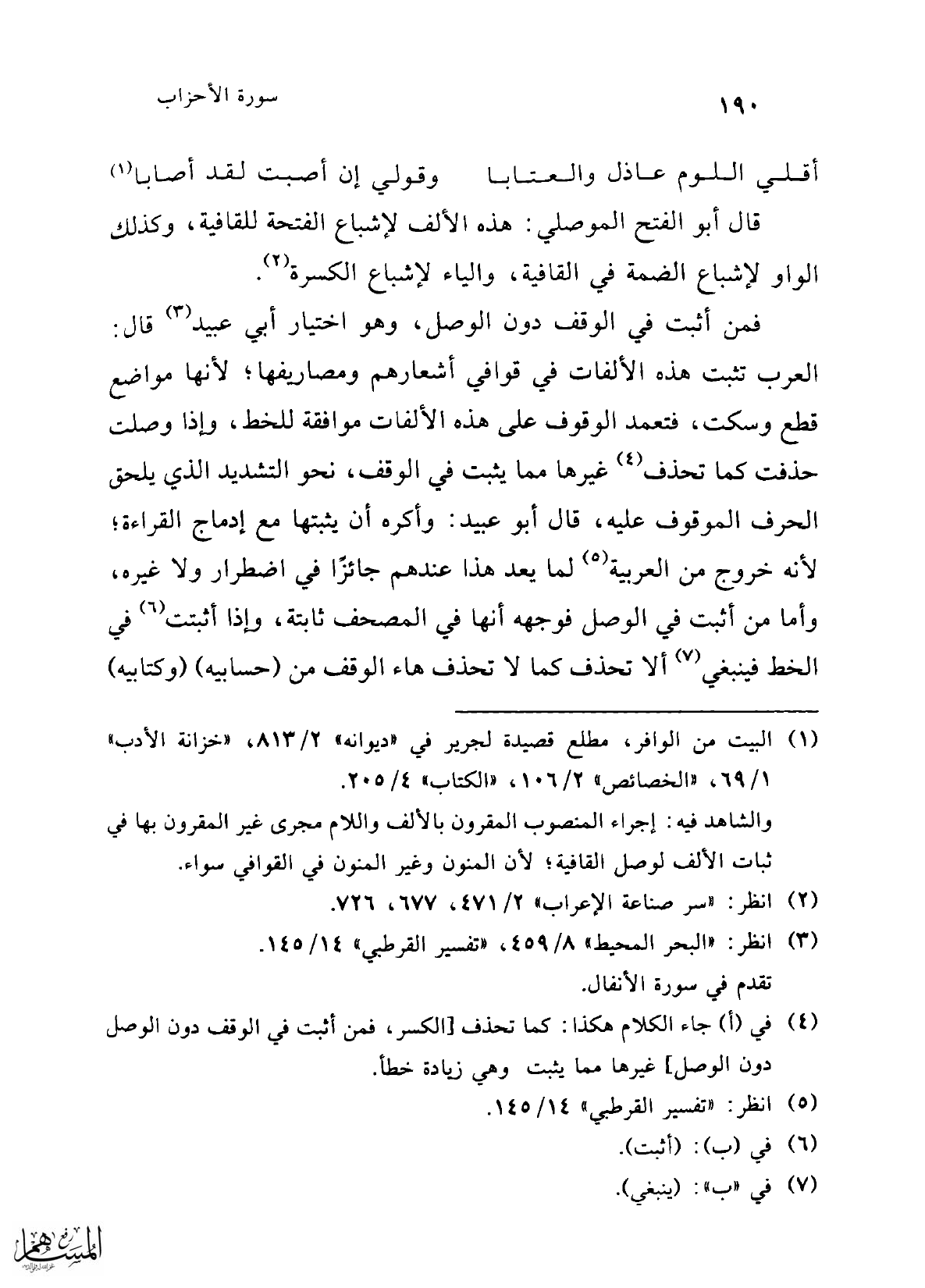 فمن أثبت في الوقف دون الوصل، وهو اختيار أبي عبيد (¬3) قال: العرب تثبت هذه الألفات في قوافي أشعارهم ومصاريفها؛ لأنها مواضع قطع وسكت، فتعمد الوقوف على هذه الألفات موافقة للخط، وإذا وصلت حذفت كما تحذف (¬4) غيرها مما يثبت في الوقف، نحو التشديد الذي يلحق الحرف الموقوف عليه، قال أبو عبيد: وأكره أن يثبتها مع إدماج القراءة؛ لأنه خروج من العربية (¬5) لما يعد هذا عندهم جائزًا في اضطرار ولا غيره، وأما من أثبت في الوصل فوجهه أنها في المصحف ثابتة، وإذا أثبتت (¬6) في الخط فينبغي (¬7) ألا تحذف كما لا تحذف هاء الوقف من (حسابيه) (وكتابيه)