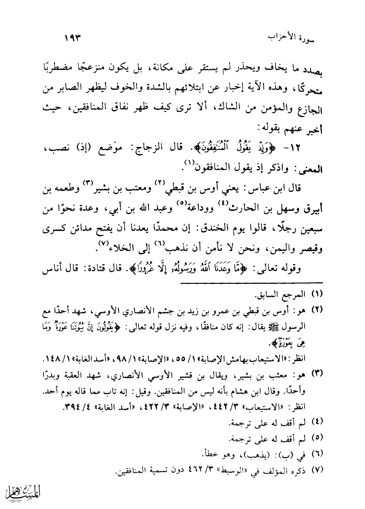(¬3) هو: معثب بن بشير، ويقال بن قشير الأوسي الأنصاري، شهد العقبة وبدرًا وأحدًا. وقال ابن هشام بأنه ليس من المنافقين. وقيل: إنه تاب مما قاله يوم أحد. انظر: "الاستيعاب" 3/ 442، "الإصابة" 3/ 422، "أسد الغابة" 4/ 394.