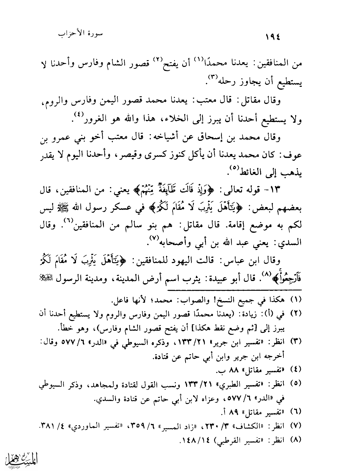 13 - قوله تعالى: {وَإِذْ قَالَتْ طَائِفَةٌ مِنْهُمْ} يعني: من المنافقين، قال بعضهم لبعض: {يَا أَهْلَ يَثْرِبَ لَا مُقَامَ لَكُمْ} في عسكر رسول الله -صلى الله عليه وسلم- ليس لكم به موضع إقامة. قال مقاتل: هم بنو سالم من المنافقين (¬6). وقال السدي: يعني عبد الله بن أبي وأصحابه (¬7).