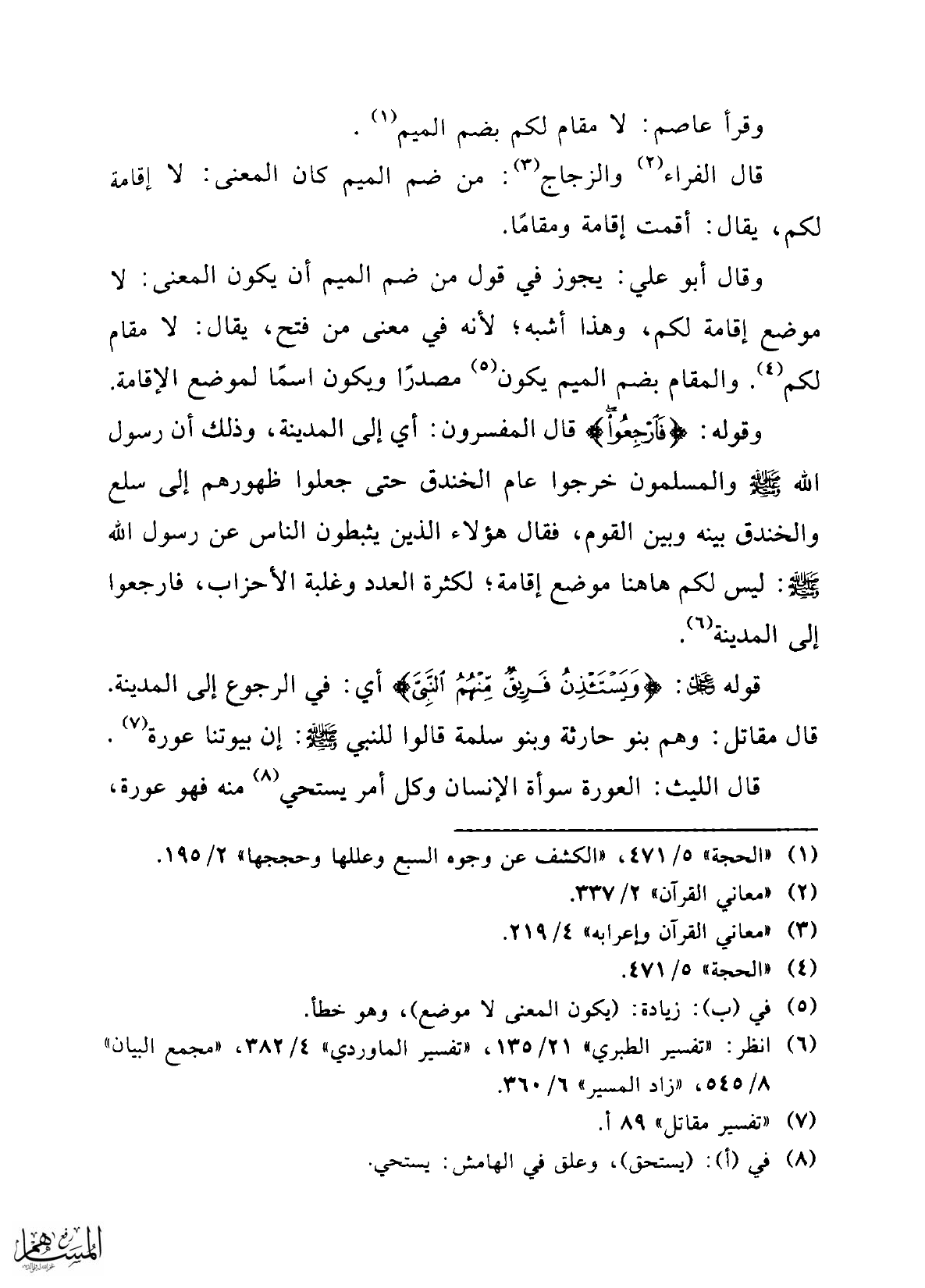 وقال أبو علي: يجوز في قول من ضم الميم أن يكون المعنى: لا موضع إقامة لكم، وهذا أشبه؛ لأنه في معنى من فتح، يقال: لا مقام لكم (¬4). والمقام بضم الميم يكون (¬5) مصدرًا ويكون اسمًا لموضع الإقامة.