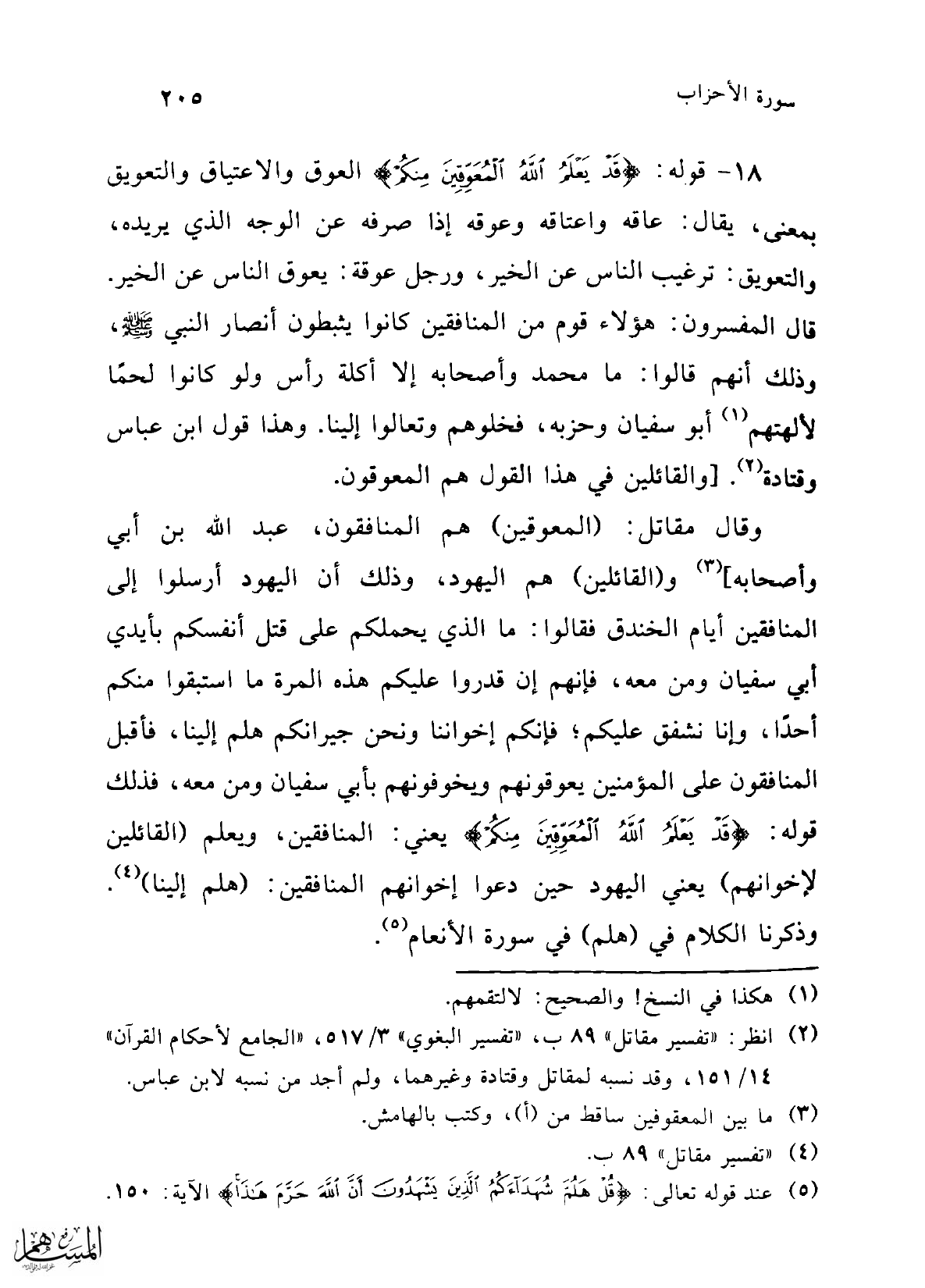 وقال مقاتل: (المعوقين) هم المنافقون، عبد الله بن أبي وأصحابه] (¬3) و (القائلين) هم اليهود، وذلك أن اليهود أرسلوا إلى المنافقين أيام الخندق فقالوا: ما الذي يحملكم على قتل أنفسكم بأيدي أبي سفيان ومن معه، فإنهم إن قدروا عليكم هذه المرة ما استبقوا منكم أحدًا، وإنا نشفق عليكم؛ فإنكم إخواننا ونحن جيرانكم هلم إلينا، فأقبل المنافقون على المؤمنين يعوقونهم ويخوفونهم بأبي سفيان ومن معه، فذلك قوله: {قَدْ يَعْلَمُ اللَّهُ الْمُعَوِّقِينَ مِنْكُمْ} يعني: المنافقين، ويعلم (القائلين لإخوانهم) يعني اليهود حين دعوا إخوانهم المنافقين: (هلم إلينا) (¬4). وذكرنا الكلام في (هلم) في سورة الأنعام (¬5).