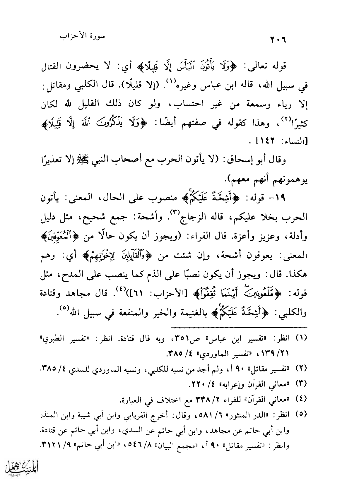 قوله تعالى: {وَلَا يَأْتُونَ الْبَأْسَ إِلَّا قَلِيلًا} أي: لا يحضرون القتال في سبيل الله، قاله ابن عباس وغيره (¬1). (إلا قليلاً). قال الكلبي ومقاتل: إلا رياء وسمعة من غير احتساب، ولو كان ذلك القليل لله لكان كثيرًا (¬2)، وهذا كقوله في صفتهم أيضًا: {وَلَا يَذْكُرُونَ اللَّهَ إِلَّا قَلِيلًا} [النساء: 142].