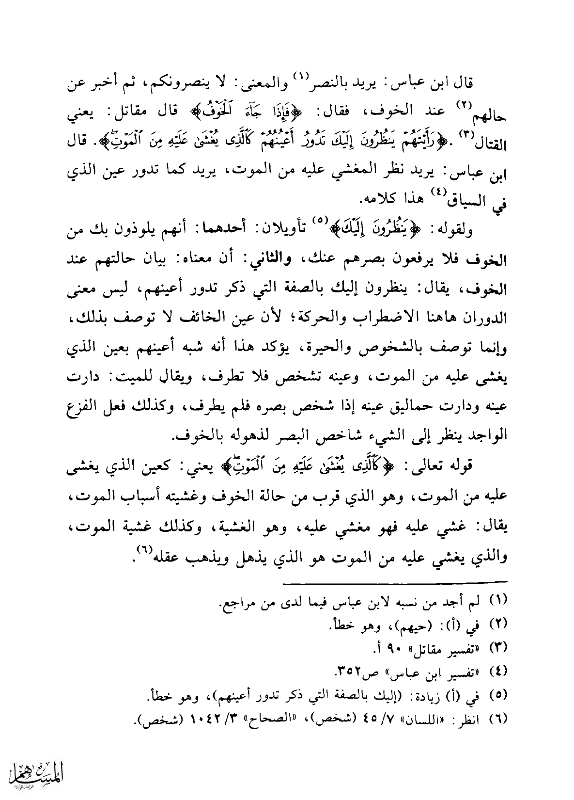 ولقوله: {يَنْظُرُونَ إِلَيْكَ} (¬5) تأويلان: أحدهما: أنهم يلوذون بك من الخوف فلا يرفعون بصرهم عنك، والثاني: أن معناه: بيان حالتهم عد الخوف، يقال: ينظرون إليك بالصفة التي ذكر تدور أعينهم، ليس معنى الدوران هاهنا الاضطراب والحركة؛ لأن عين الخائف لا توصف بذلك، وإنما توصف بالشخوص والحيرة، يؤكد هذا أنه شبه أعينهم بعين الذي يغشى عليه من الموت، وعينه تشخص فلا تطرف، ويقال للميت: دارت عينه ودارت حماليق عينه إذا شخص بصره فلم يطرف، وكذلك فعل الفزع الواجد ينظر إلى الشيء شاخص البصر لذهوله بالخوف.
