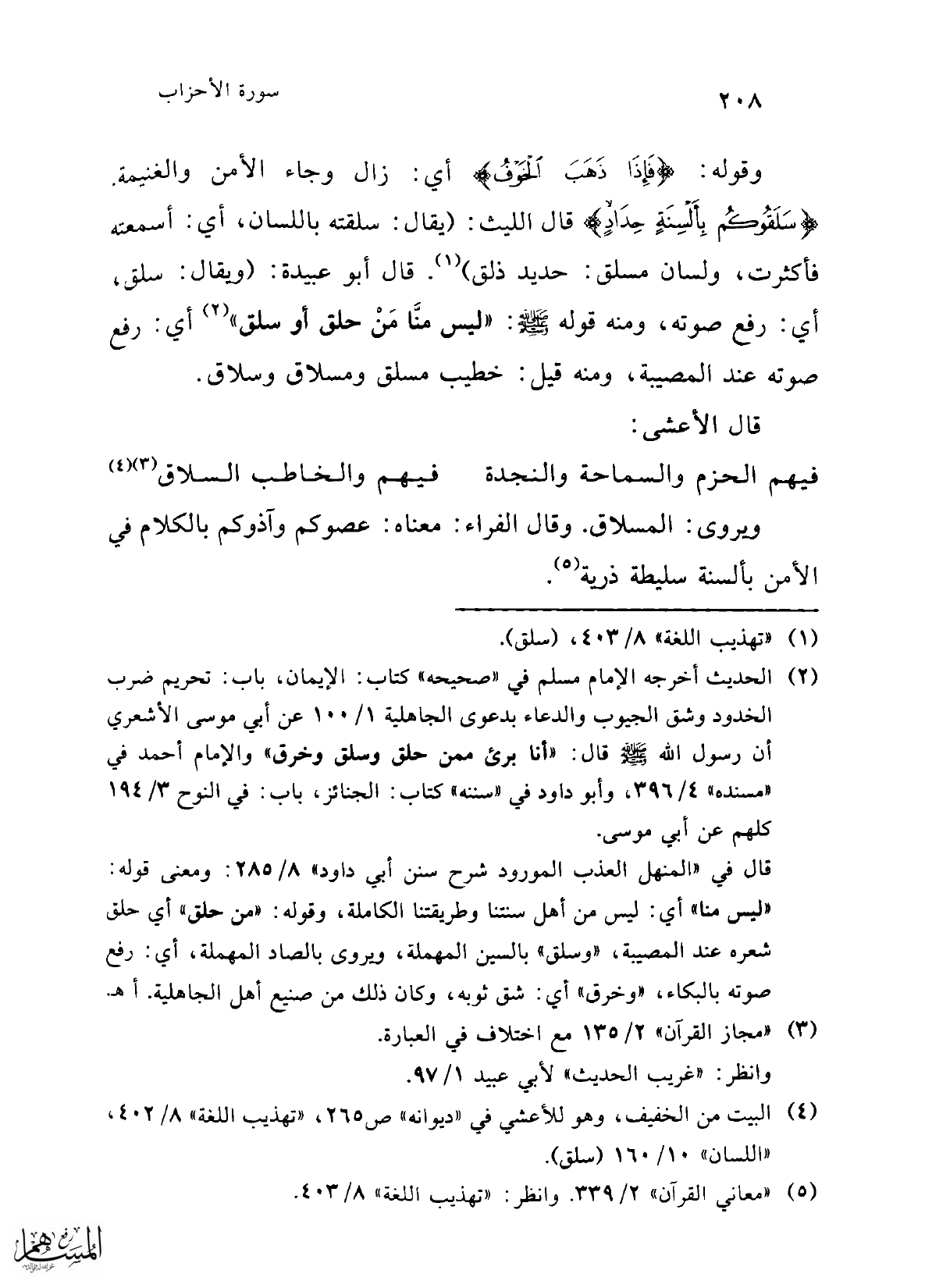 وقوله: {فَإِذَا ذَهَبَ الْخَوْفُ} أي: زال وجاء الأمن والغنيمة. {سَلَقُوكُمْ بِأَلْسِنَةٍ حِدَادٍ} قال الليث: (يقال: سلقته باللسان، أي: أسمعته فأكثرت، ولسان مسلق: حديد ذلق) (¬1). قال أبو عبيدة: (ويقال: سلق، أي: رفع صوته، ومنه قوله -صلى الله عليه وسلم-: "ليس منَّا مَنْ حلق أو سلق" (¬2) أي: رفع صوته عند المصيبة، ومنه قيل: خطيب مسلق ومسلاق وسلاق.