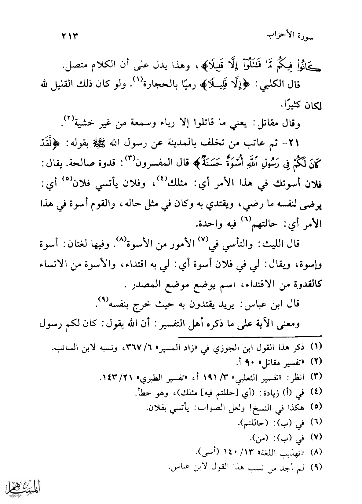 21 - ثم عاتب من تخلف بالمدينة عن رسول الله -صلى الله عليه وسلم- بقوله: {لَقَدْ كَانَ لَكُمْ فِي رَسُولِ اللَّهِ أُسْوَةٌ حَسَنَةٌ} قال المفسرون (¬3): قدوة صالحة. يقال: فلان أسوتك في هذا الأمر أي: مثلك (¬4)، وفلان يأتسي فلان (¬5) أي: يرضى لنفسه ما رضي، ويقتدي به وكان في مثل حاله، والقوم أسوة في هذا الأمر أي: حالتهم (¬6) فيه واحدة.
