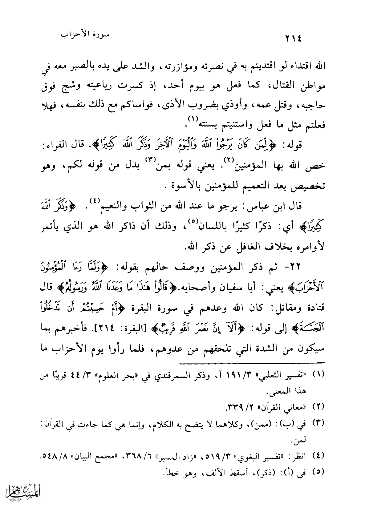 قوله: {لِمَنْ كَانَ يَرْجُو اللَّهَ وَالْيَوْمَ الْآخِرَ وَذَكَرَ اللَّهَ كَثِيرًا}. قال الفراء: خص الله بها المؤمنين (¬2). يعني قوله بمن (¬3) بدل من قوله لكم، وهو تخصيص بعد التعميم للمؤمنين بالأسوة.