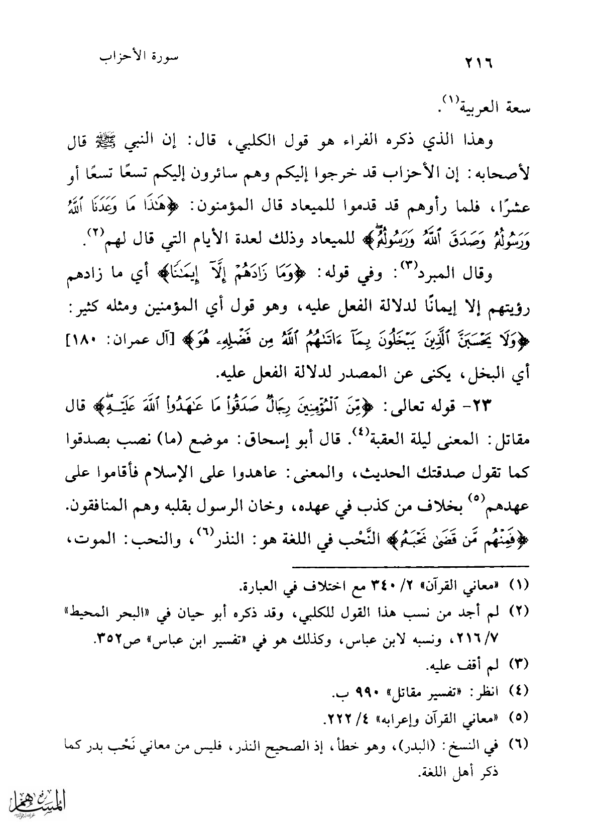 وهذا الذي ذكره الفراء هو قول الكلبي، قال: إن النبي -صلى الله عليه وسلم- قال لأصحابه: إن الأحزاب قد خرجوا إليكم وهم سائرون إليكم تسعًا تسعًا أو عشرًا، فلما رأوهم قد قدموا للميعاد قال المؤمنون: {هَذَا مَا وَعَدَنَا اللَّهُ وَرَسُولُهُ وَصَدَقَ اللَّهُ وَرَسُولُهُ} للميعاد وذلك لعدة الأيام التي قال لهم (¬2).