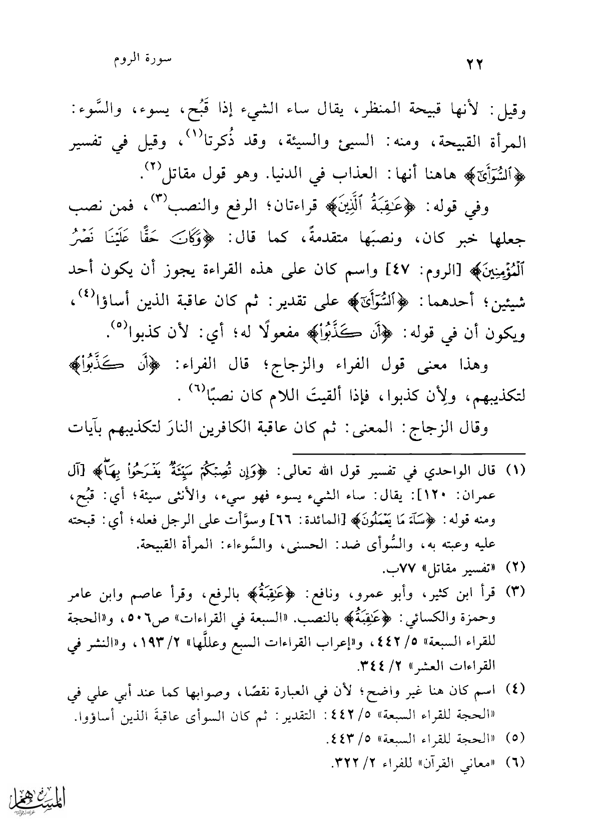 (¬4) اسم كان هنا غير واضح؛ لأن في العبارة نقصًا، وصوابها كما عند أبي علي في "الحجة للقراء السبعة" 5/ 442: التقدير: ثم كان السوأى عاقبةَ الذين أساؤوا.