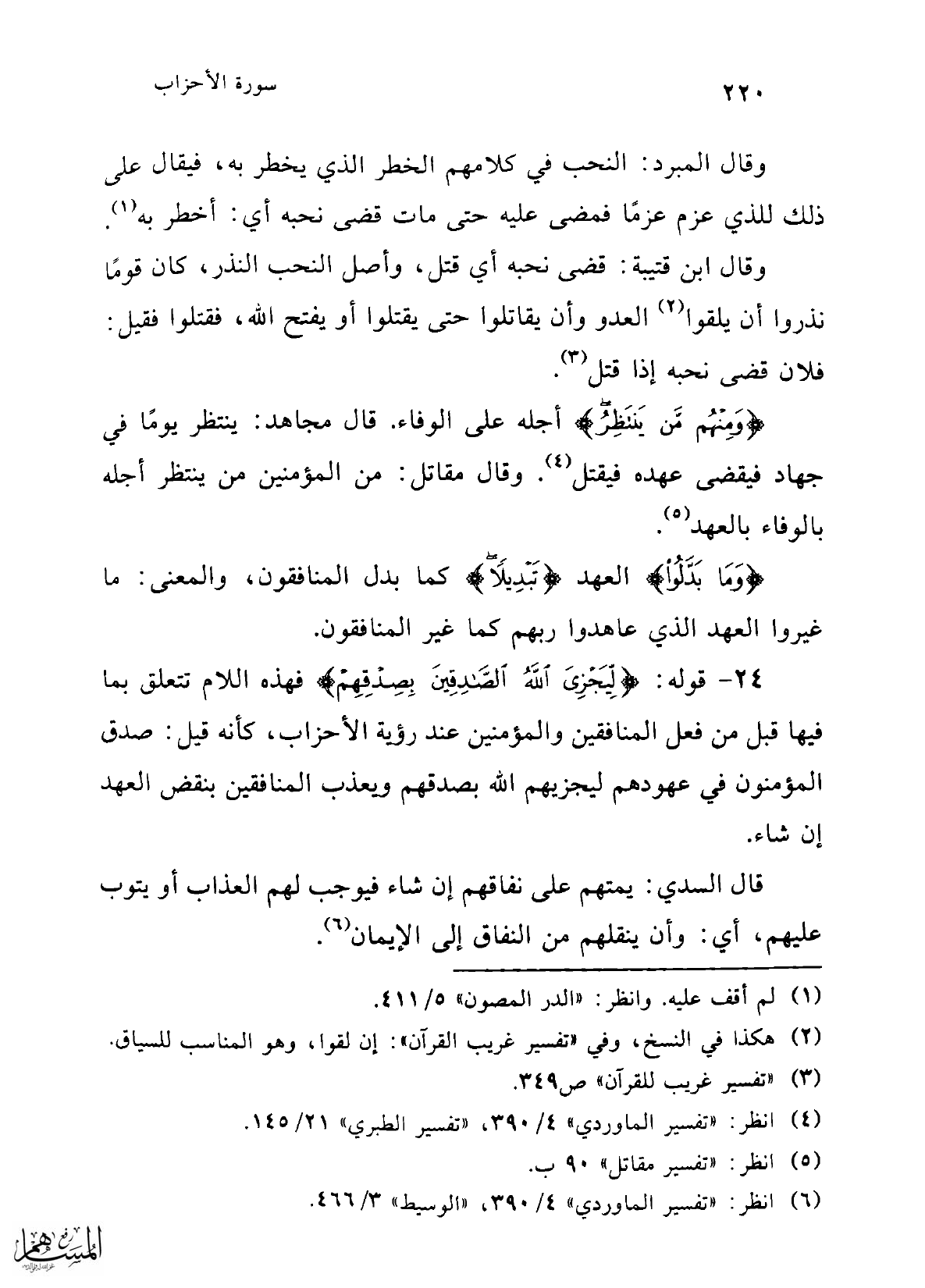 وقال المبرد: النحب في كلامهم الخطر الذي يخطر به، فيقال على ذلك للذي عزم عزمًا فمضى عليه حتى مات قضى نحبه أي: أخطر به (¬1).