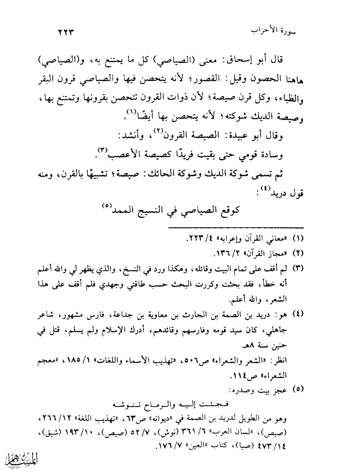 قال أبو إسحاق: معنى (الصياصي) كل ما يمتنع به، و (الصياصي) هاهنا الحصون وقيل: القصور؛ لأنه يتحصن فيها والصياصي قرون البقر والظباء، وكل قرن صيصة؛ لأن ذوات القرون تتحصن بقرونها وتمتنع بها، وصيصة الديك شوكته؛ لأنه يتحصن بها أيضًا (¬1).