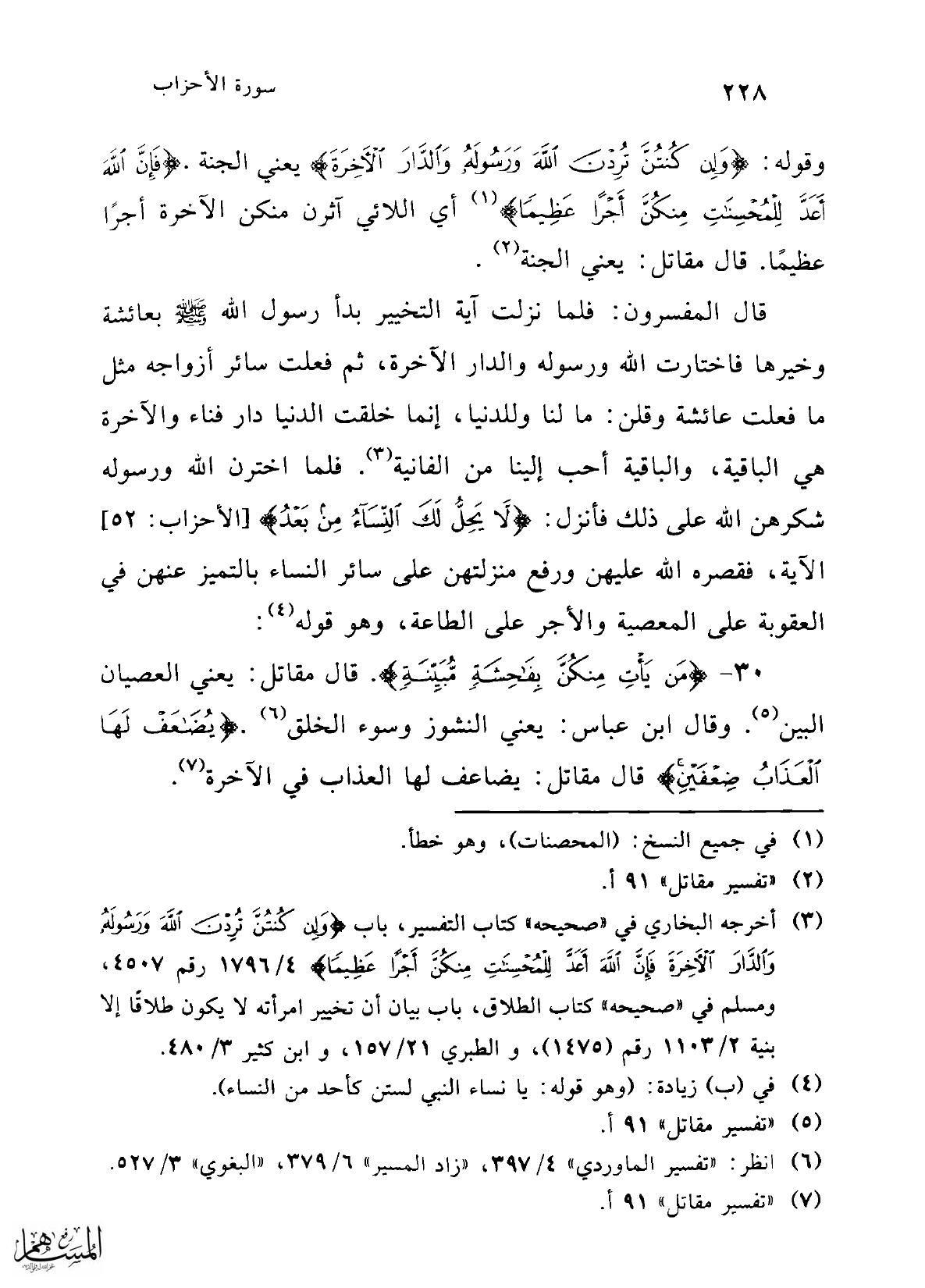 وقوله: {وَإِنْ كُنْتُنَّ تُرِدْنَ اللَّهَ وَرَسُولَهُ وَالدَّارَ الْآخِرَةَ} يعني الجنة {فَإِنَّ اللَّهَ أَعَدَّ لِلْمُحْسِنَاتِ مِنْكُنَّ أَجْرًا عَظِيمًا} (¬1) أي اللائي آثرن منكن الآخرة أجرًا عظيمًا. قال مقاتل: يعني الجنة (¬2).