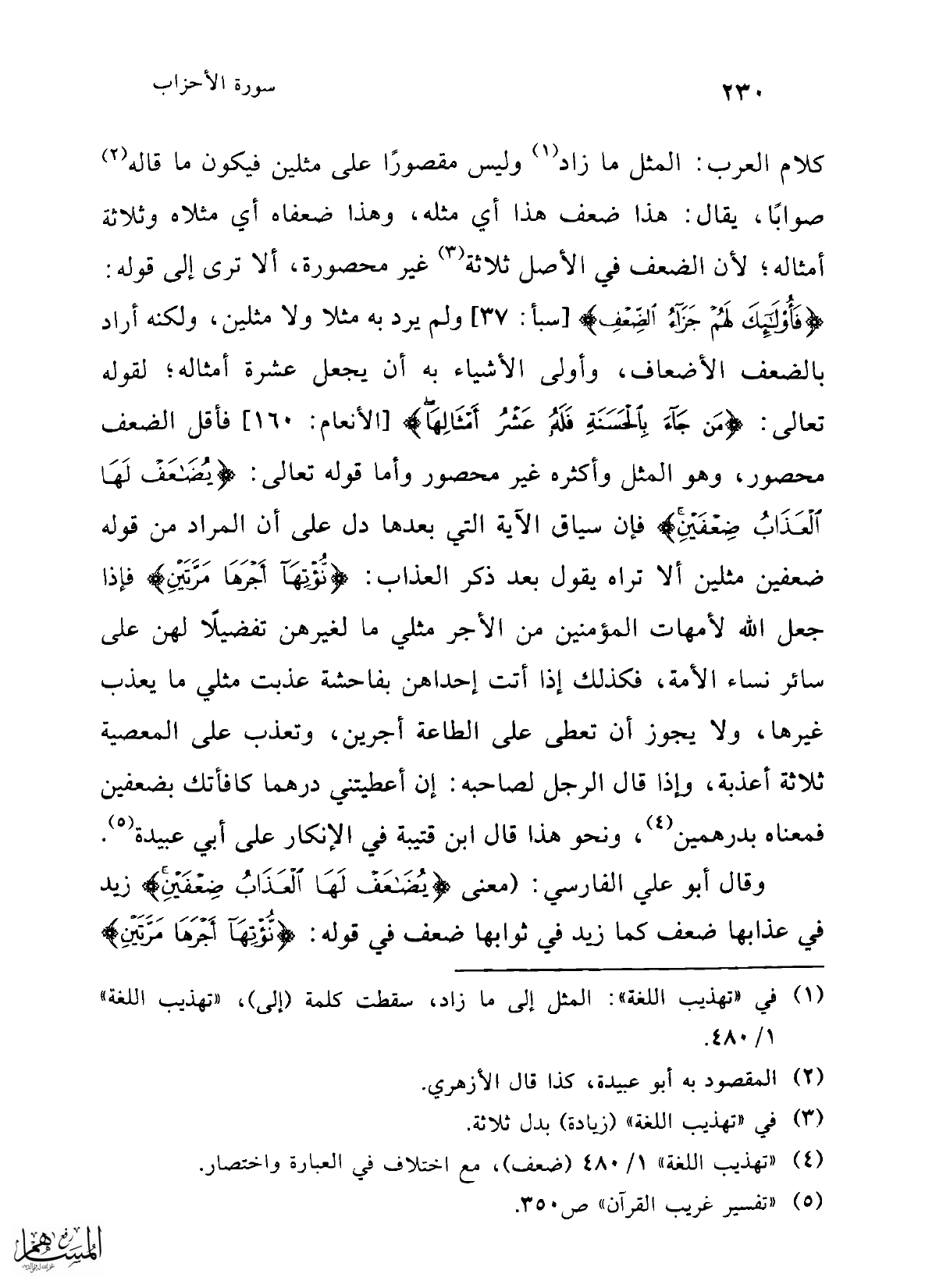 كلام العرب: المثل ما زاد (¬1) وليس مقصورًا على مثلين فيكون ما قاله (¬2) صوابًا، يقال: هذا ضعف هذا أي مثله، وهذا ضعفاه أي مثلاه وثلاثة أمثاله؛ لأن الضعف في الأصل ثلاثة (¬3) غير محصورة، ألا ترى إلى قوله: {فَأُولَئِكَ لَهُمْ جَزَاءُ الضِّعْفِ} [سبأ: 37] ولم يرد به مثلا ولا مثلين، ولكنه أراد بالضعف الأضعاف، وأولى الأشياء به أن يجعل عشرة أمثاله؛ لقوله تعالى: {مَنْ جَاءَ بِالْحَسَنَةِ فَلَهُ عَشْرُ أَمْثَالِهَا} [الأنعام: 160] فأقل الضعف محصور، وهو المثل وأكثره غير محصور وأما قوله تعالى: {يُضَاعَفْ لَهَا الْعَذَابُ ضِعْفَيْنِ} فإذا سياق الآية التي بعدها دل على أن المراد من قوله ضعفين مثلين ألا تراه يقول بعد ذكر العذاب: {نُؤْتِهَا أَجْرَهَا مَرَّتَيْنِ} فإذا جعل الله لأمهات المؤمنين من الأجر مثلي ما لغيرهن تفضيلًا لهن على سائر نساء الأمة، فكذلك إذا أتت إحداهن بفاحشة عذبت مثلي ما يعذب غيرها، ولا يجوز أن تعطى على الطاعة أجرين، وتعذب على المعصية ثلاثة أعذبة، وإذا قال الرجل لصاحبه: إن أعطيتني درهما كافأتك بضعفين فمعناه بدرهمين (¬4)، ونحو هذا قال ابن قتيبة في الإنكار على أبي عبيدة (¬5).