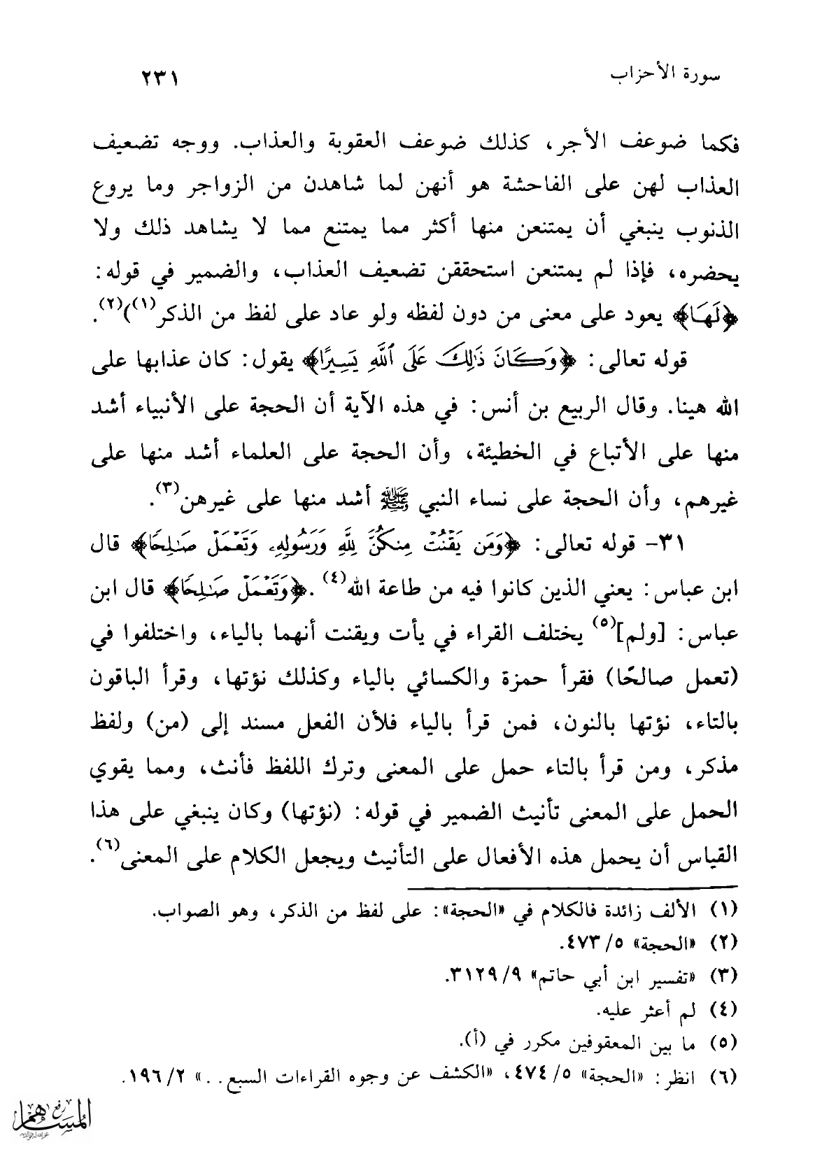 فكما ضوعف الأجر، كذلك ضوعف العقوبة والعذاب. ووجه تضعيف العذاب لهن على الفاحشة هو أنهن لما شاهدن من الزواجر وما يروع الذنوب ينبغي أن يمتنعن منها أكثر مما يمتنع مما لا يشاهد ذلك ولا يحضره، فإذا لم يمتنعن استحققن تضعيف العذاب، والضمير في قوله: {لَهَا} يعود على معنى من دون لفظه ولو عاد على لفظ من الذكر (¬1)) (¬2).