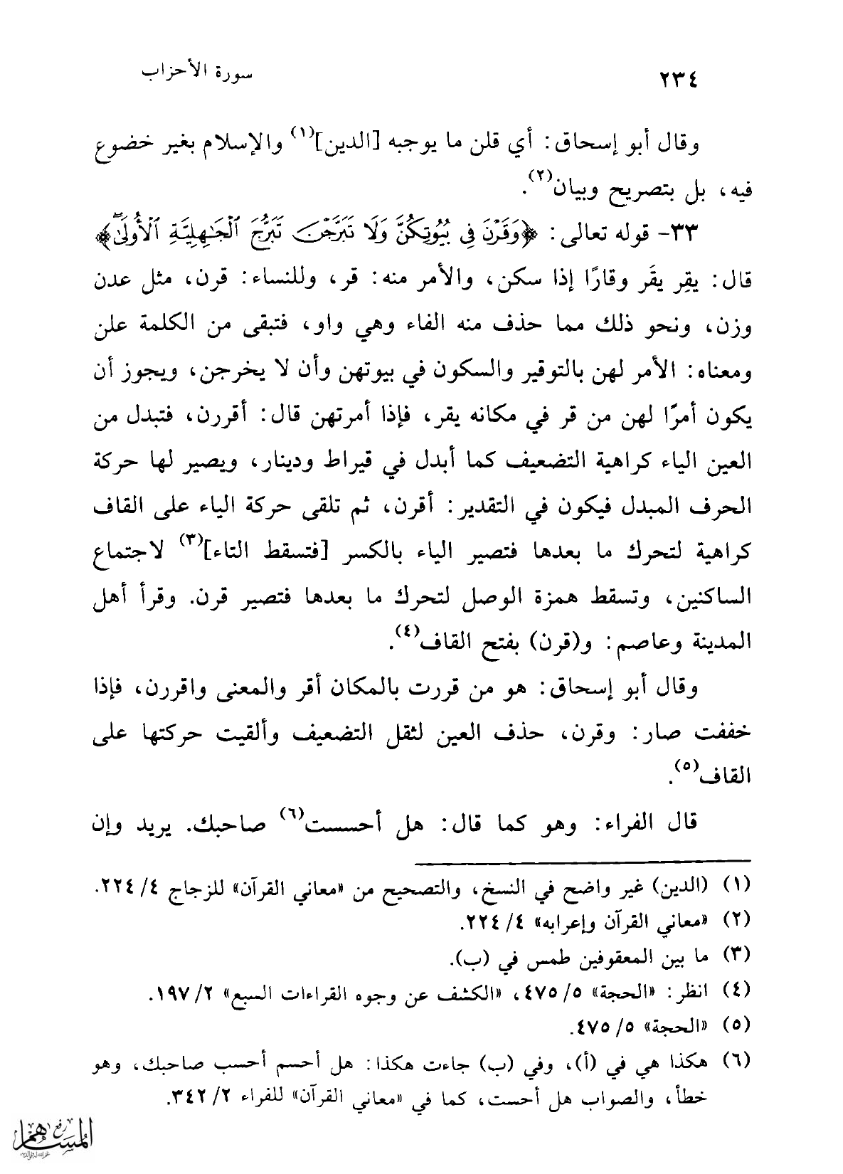 وقال أبو إسحاق: هو من قررت بالمكان أقر والمعنى واقررن، فإذا خففت صار: وقرن، حذف العين لثقل التضعيف وألقيت حركتها على القاف (¬5).