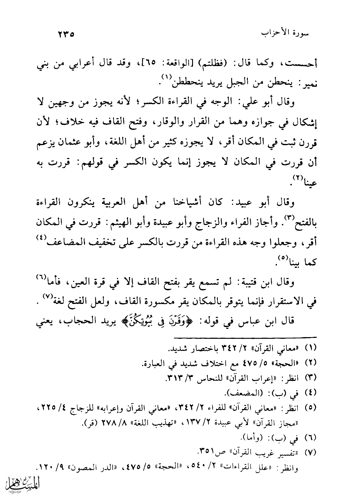 وقال أبو علي: الوجه في القراءة الكسر؛ لأنه يجوز من وجهين لا إشكال في جوازه وهما من القرار والوقار، وفتح القاف فيه خلاف؛ لأن قررن ثبت في المكان أقر، لا يجوزه كثير من أهل اللغة، وأبو عثمان يزعم أن قررت في المكان لا يجوز إنما يكون الكسر في قولهم: قررت به عينا (¬2).