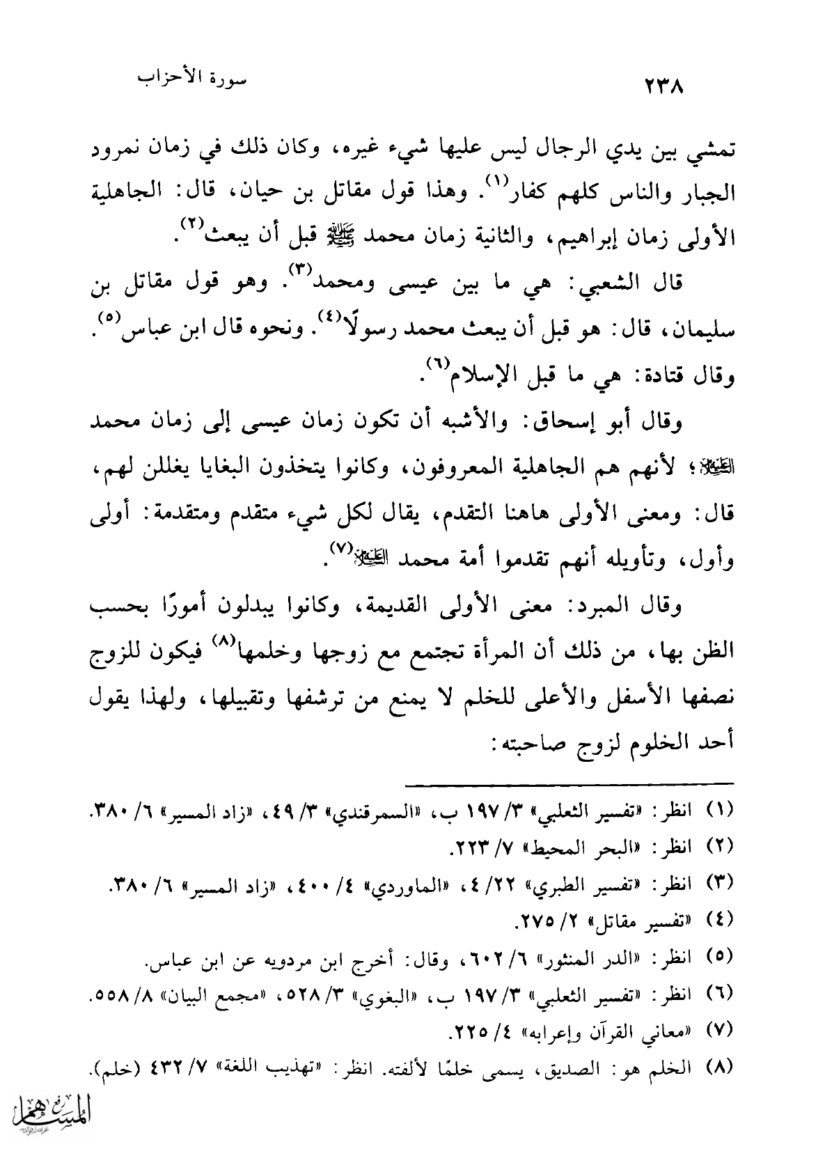 وقال أبو إسحاق: والأشبه أن تكون زمان عيسى إلى زمان محمد -عليه السلام-. لأنهم هم الجاهلية المعروفون، وكانوا يتخذون البغايا يغللن لهم، قال: ومعنى الأولى هاهنا التقدم، يقال لكل شيء متقدم ومتقدمة: أولى وأول، وتأويله أنهم تقدموا أمة محمد -عليه السلام- (¬7).
