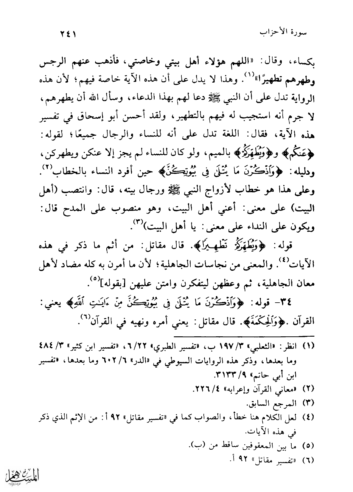 قوله: {وَيُطَهِّرَكُمْ تَطْهِيرًا}. قال مقاتل: من أثم ما ذكر في هذه الآيات (¬4). والمعنى من نجاسات الجاهلية؛ لأن ما أمرن به كله مضاد لأهل معان الجاهلية، ثم وعظهن ليتفكرن وامتن عليهن [بقوله] (¬5).