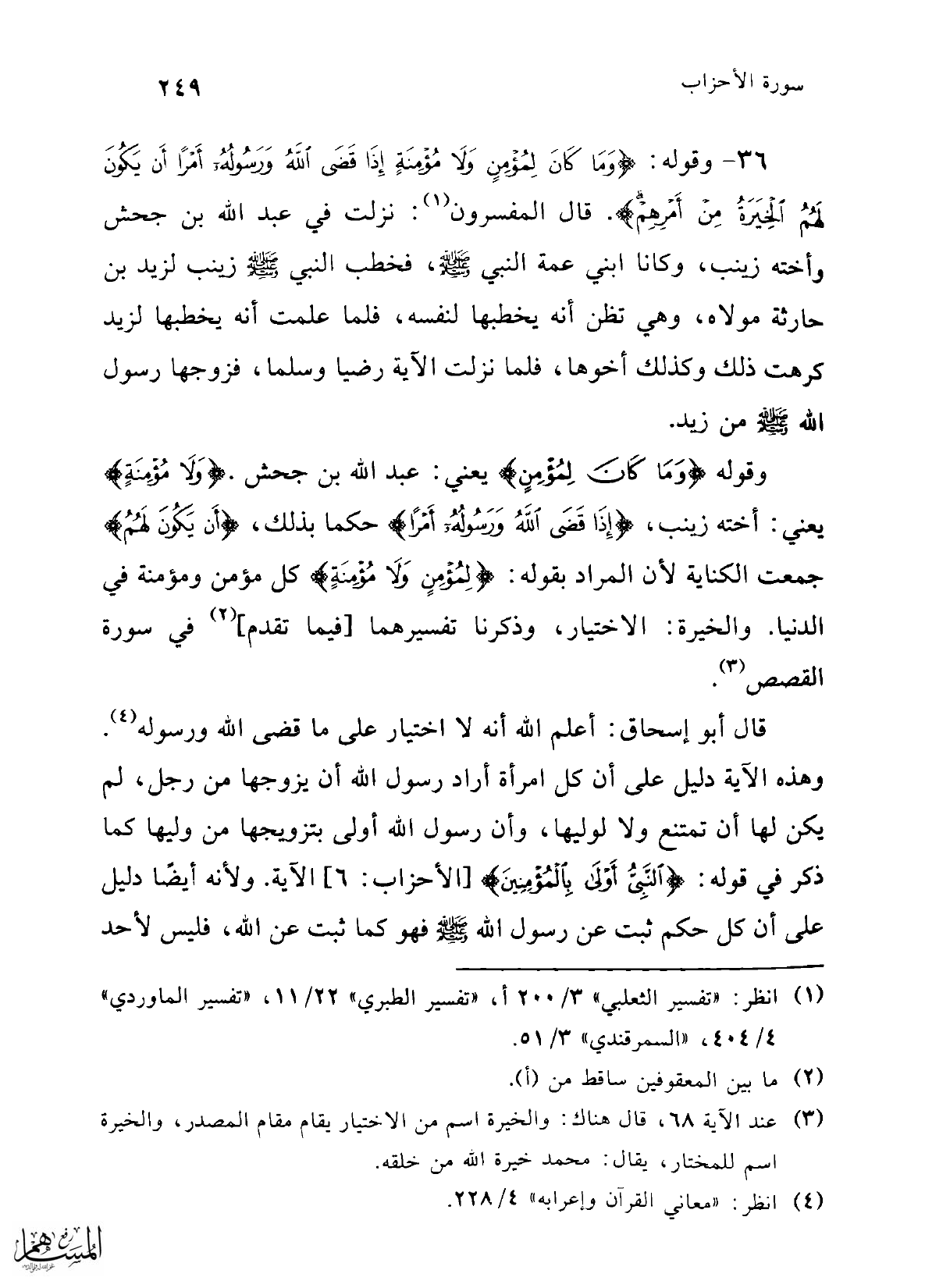 36 - وقوله: {وَمَا كَانَ لِمُؤْمِنٍ وَلَا مُؤْمِنَةٍ إِذَا قَضَى اللَّهُ وَرَسُولُهُ أَمْرًا أَنْ يَكُونَ لَهُمُ الْخِيَرَةُ مِنْ أَمْرِهِمْ}. قال المفسرون (¬1): نزلت في عبد الله بن جحش وأخته زينب، وكانا ابني عمة النبي -صلى الله عليه وسلم-، فخطب النبي -صلى الله عليه وسلم- زينب لزيد بن حارثة مولاه، وهي تظن أنه يخطبها لنفسه، فلما علمت أنه يخطبها لزيد كرهت ذلك وكذلك أخوها، فلما نزلت الآية رضيا وسلما، فزوجها رسول الله -صلى الله عليه وسلم- من زيد.