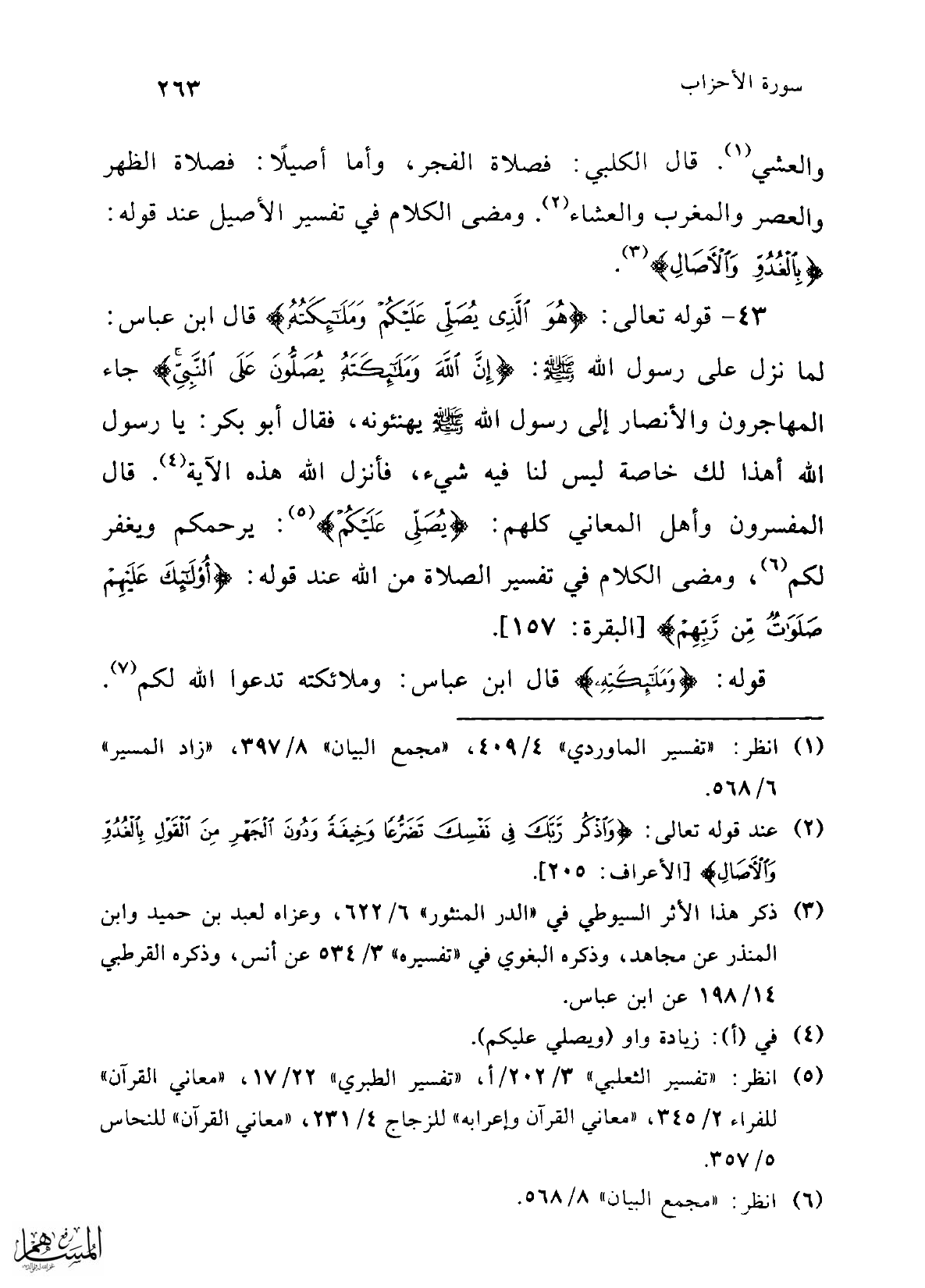 43 - قوله تعالى: {هُوَ الَّذِي يُصَلِّي عَلَيْكُمْ وَمَلَائِكَتُهُ لِيُخْرِجَكُمْ} قال ابن عباس: لما نزل على رسول الله -صلى الله عليه وسلم-: {إِنَّ اللَّهَ وَمَلَائِكَتَهُ يُصَلُّونَ عَلَى النَّبِيِّ} جاء المهاجرون والأنصار إلى رسول الله -صلى الله عليه وسلم- يهنئونه، فقال أبو بكر: يا رسول الله أهذا لك خاصة ليس لنا فيه شيء، فأنزل الله هذه الآية (¬4). قال المفسرون وأهل المعاني كلهم: {يُصَلِّي} (¬5): يرحمكم ويغفر لكم (¬6)، ومضى الكلام في تفسير الصلاة من الله عند قوله: {أُولَئِكَ عَلَيْهِمْ صَلَوَاتٌ مِنْ رَبِّهِمْ} [البقرة: 157].