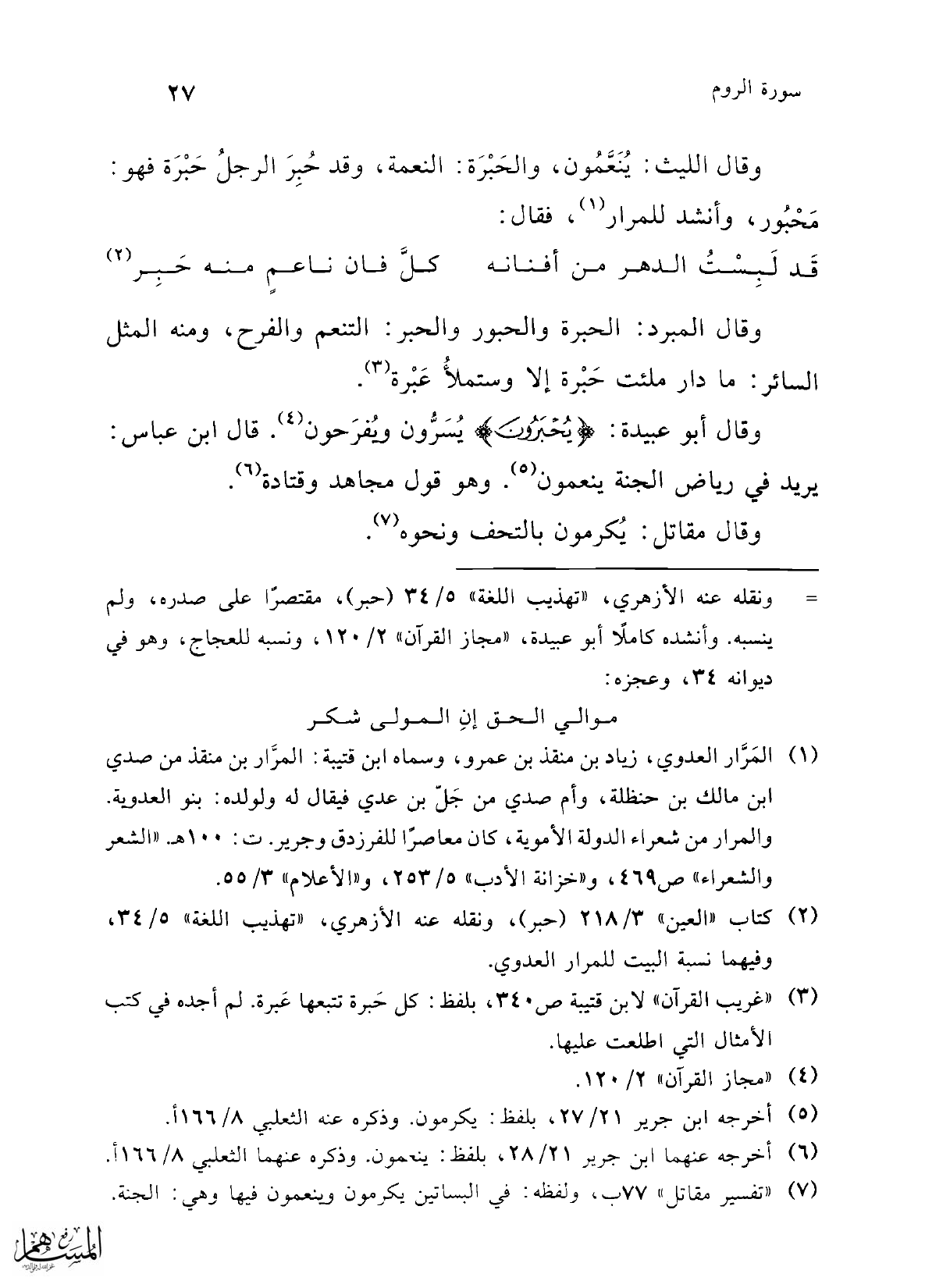 وقال أبو عبيدة: {يُحْبَرُونَ} يُسَرُّون ويُفرَحون (¬4). قال ابن عباس: يريد في رياض الجنة ينعمون (¬5). وهو قول مجاهد وقتادة (¬6).