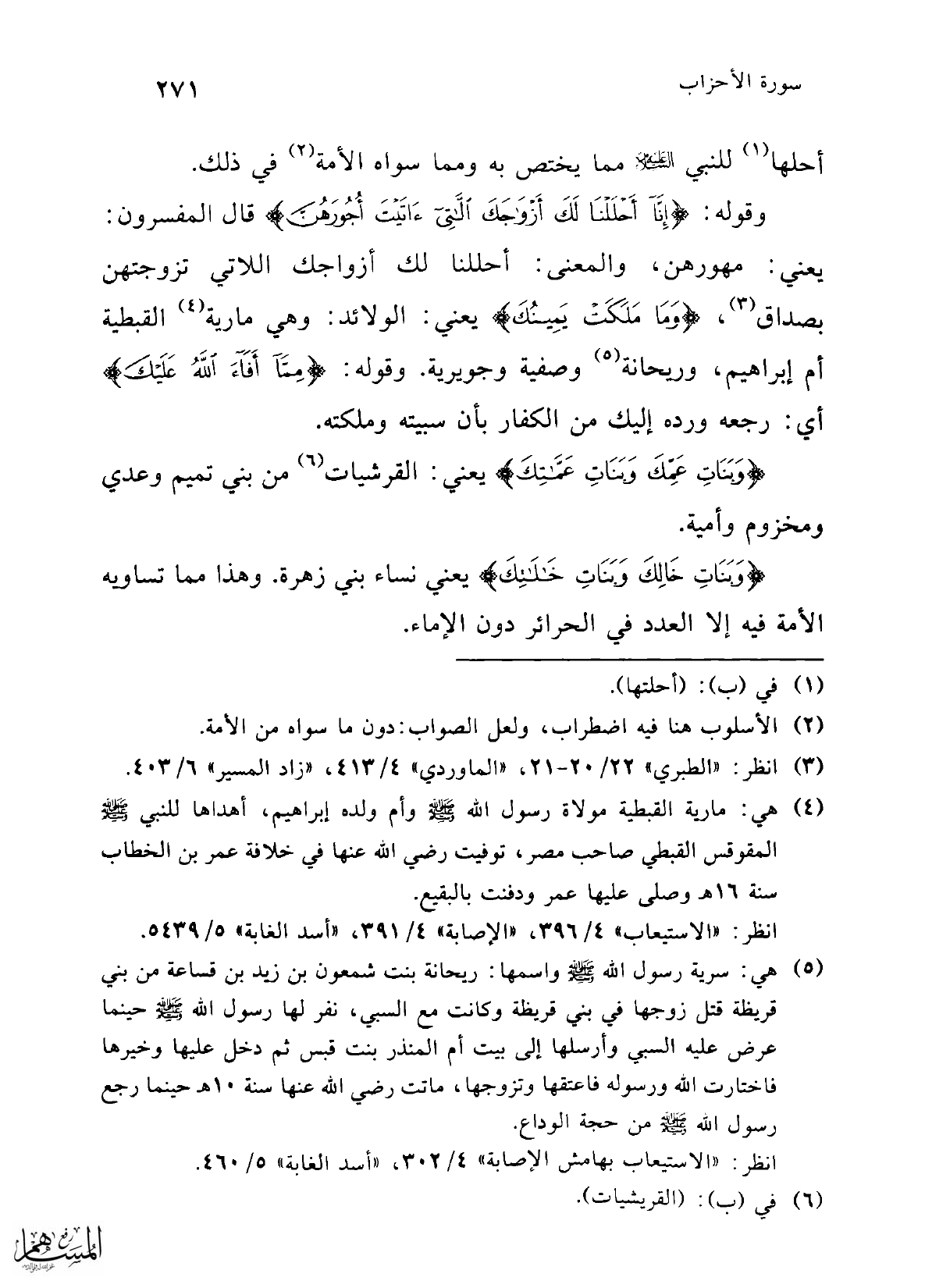 (¬4) هي: مارية القطية مولاة رسول الله -صلى الله عليه وسلم- وأم ولده إبراهيم، أهداها للنبي -صلى الله عليه وسلم- المقوقس القبطي صاحب مصر، توفيت رضي الله عنها في خلافة عمر بن الخطاب سنة 16 هـ وصلى عليها عمر ودفنت بالبقيع.