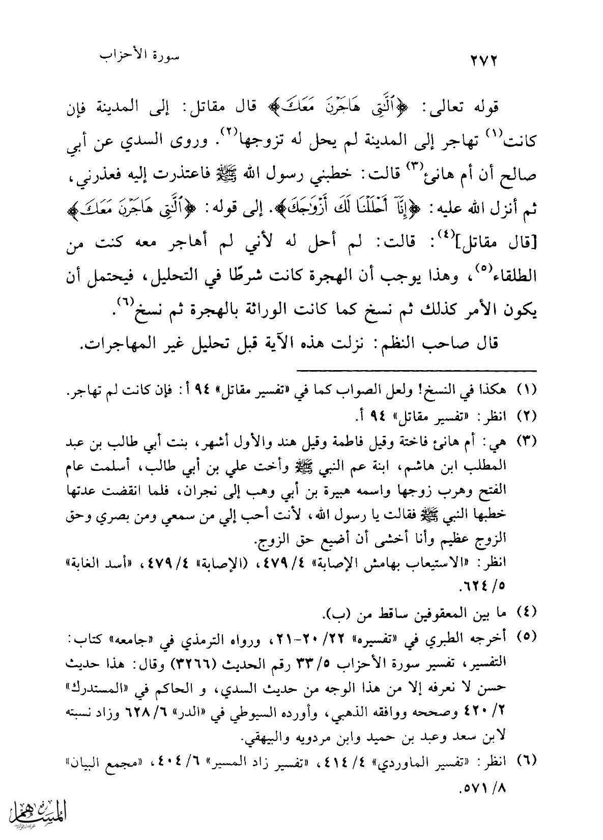 قوله تعالى: {اللَّاتِي هَاجَرْنَ مَعَكَ} قال مقاتل: إلى المدينة فإن كانت (¬1) تهاجر إلى المدينة لم يحل له تزوجها (¬2). وروى السدي عن أبيِ صالح أن أم هانئ (¬3) قالت: خطبني رسول الله -صلى الله عليه وسلم- فاعتذرت إليه فعذرني، ثم أنزل الله عليه: {إِنَّا أَحْلَلْنَا لَكَ أَزْوَاجَكَ}. إلى قوله: {اللَّاتِي هَاجَرْنَ مَعَكَ} [قال مقاتل] (¬4): قالت: لم أحل له لأني لم أهاجر معه كنت من الطلقاء (¬5)، وهذا يوجب أن الهجرة كانت شرطًا في التحليل، فيحتمل أن يكون الأمر كذلك ثم نسخ كما كانت الوراثة بالهجرة ثم نسخ (¬6).