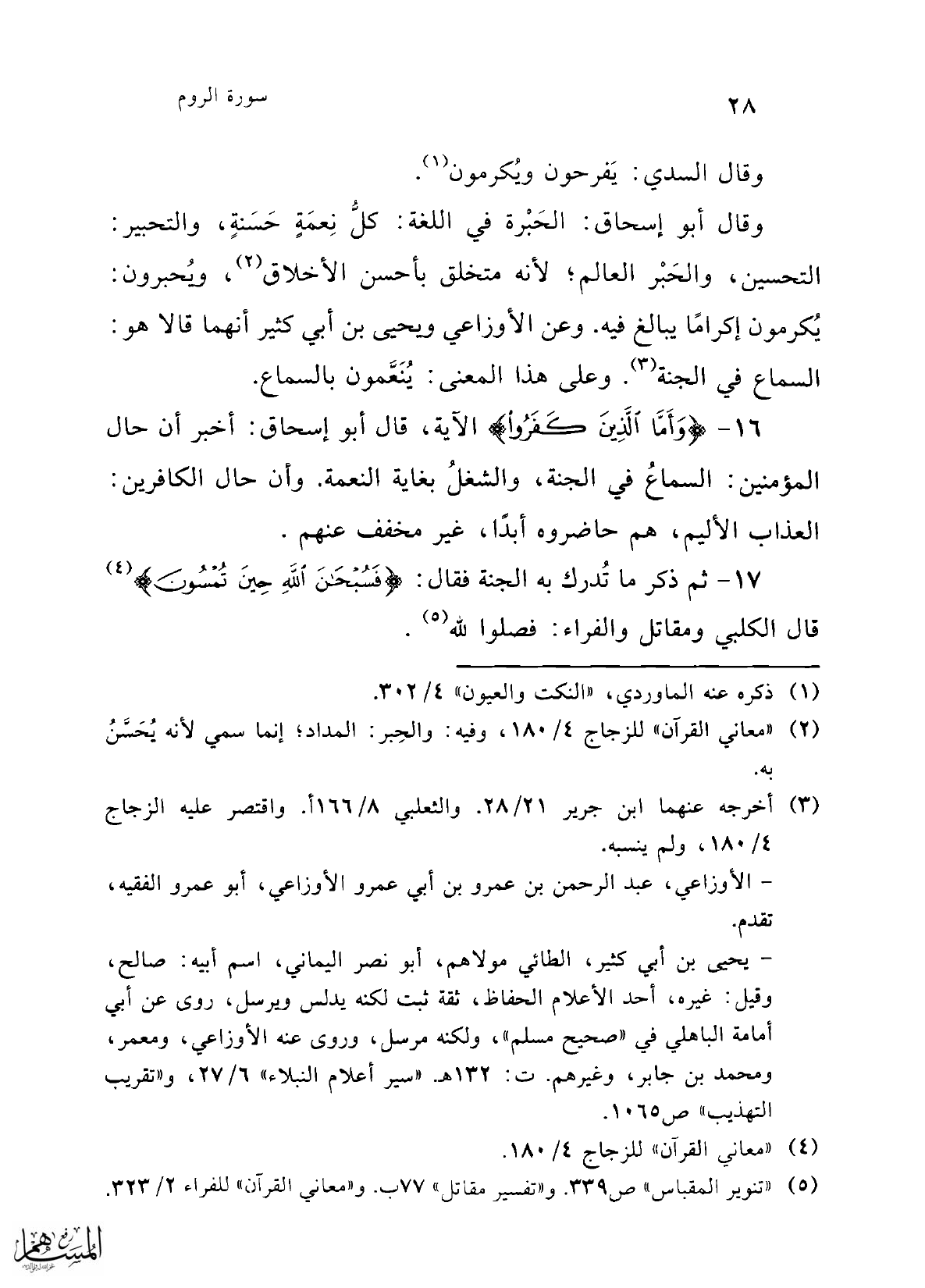 وقال أبو إسحاق: الحَبْرة في اللغة: كلُّ نِعمَةٍ حَسَنةٍ، والتحبير: التحسين، والحَبْر العالم؛ لأنه متخلق بأحسن الأخلاق (¬2)، وُيحبرون: يُكرمون إكرامًا يبالغ فيه. وعن الأوزاعي ويحيى بن أبي كثير أنهما قالا هو: السماع في الجنة (¬3). وعلى هذا المعنى: يُنَعَّمون بالسماع.