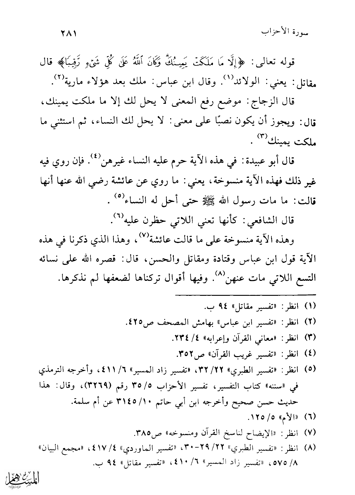 (¬8) انظر: "تفسير الطبري" 22/ 29 - 30، "تفسير المادردي" 4/ 417، "مجمع البيان" 8/ 575، "تفسير زاد المسير" 6/ 410، "تفسير مقاتل" 94 ب.